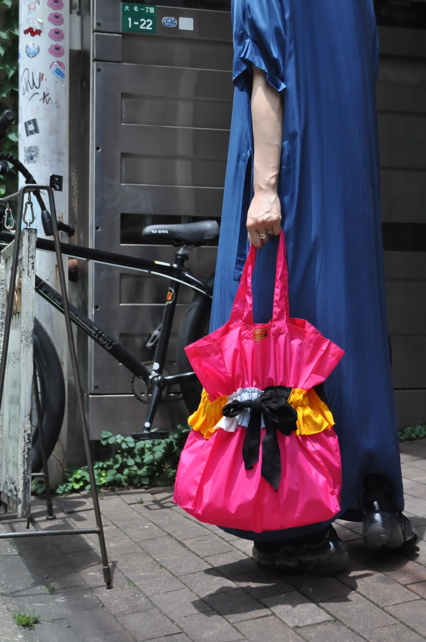 ユーズドのTシャツをパッチワークしたナイロンバッグ。