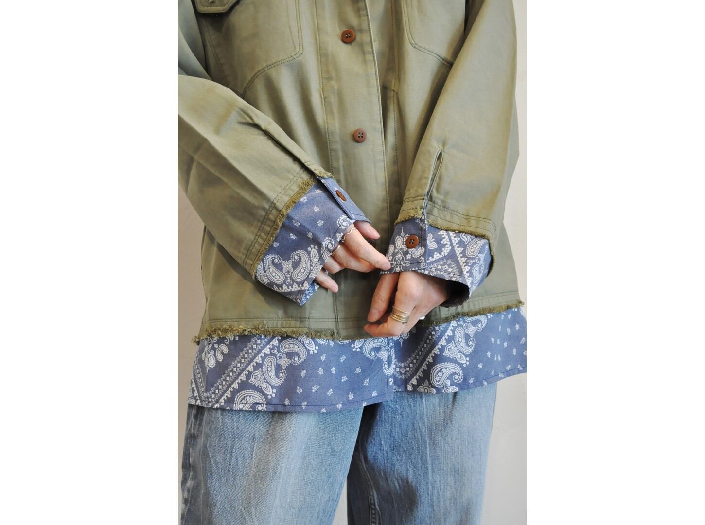 袖口や裾のバンダナモチーフ生地にも物語があり、自分が使用していたバンダナは汚れが目立つため、裏返して使用したというイメージなので、模様なども色褪せたものになっています。