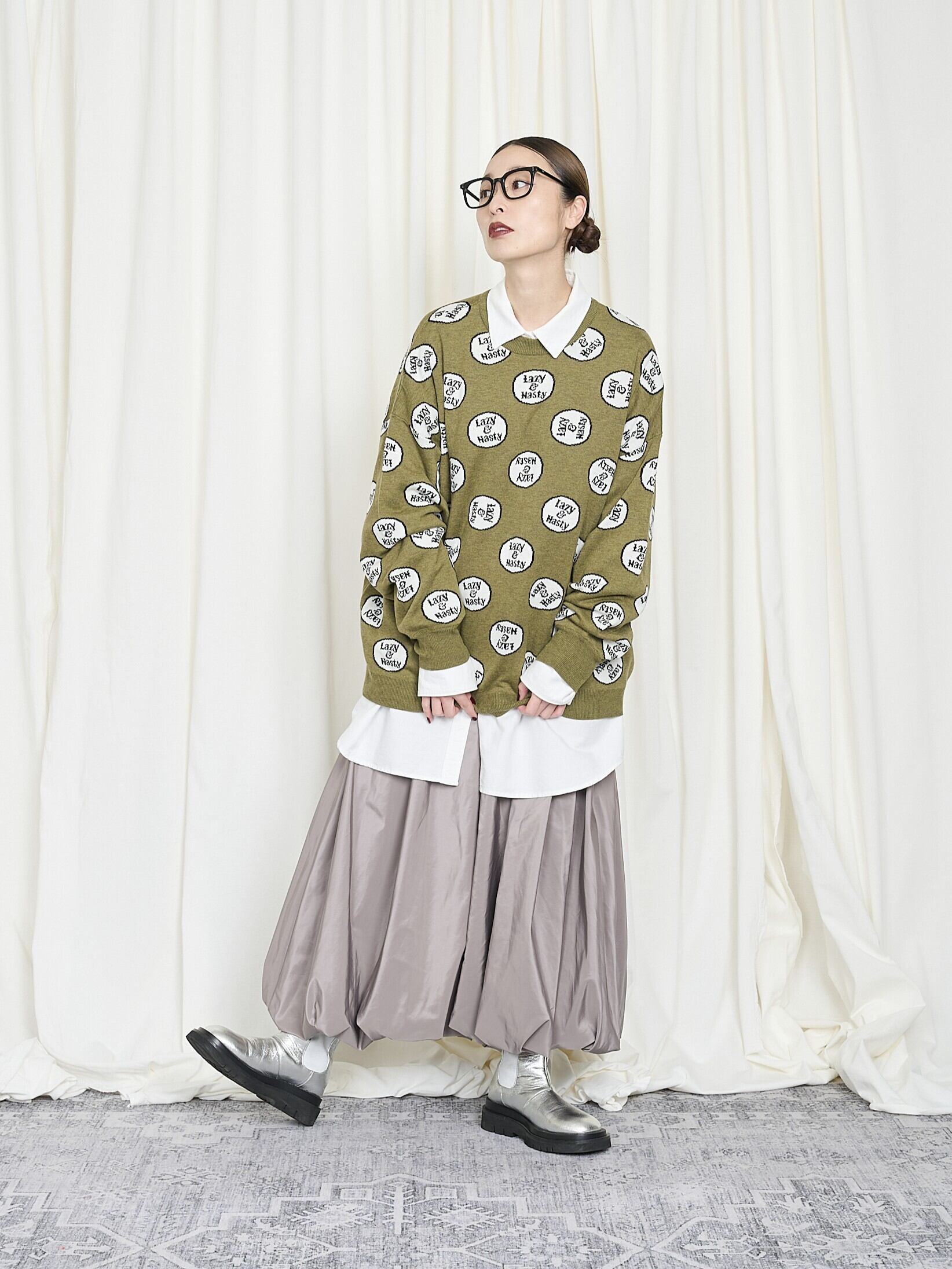今回のテーマになっているロゴを総柄に配したオーバーサイズのダブルジャガードのニットです。