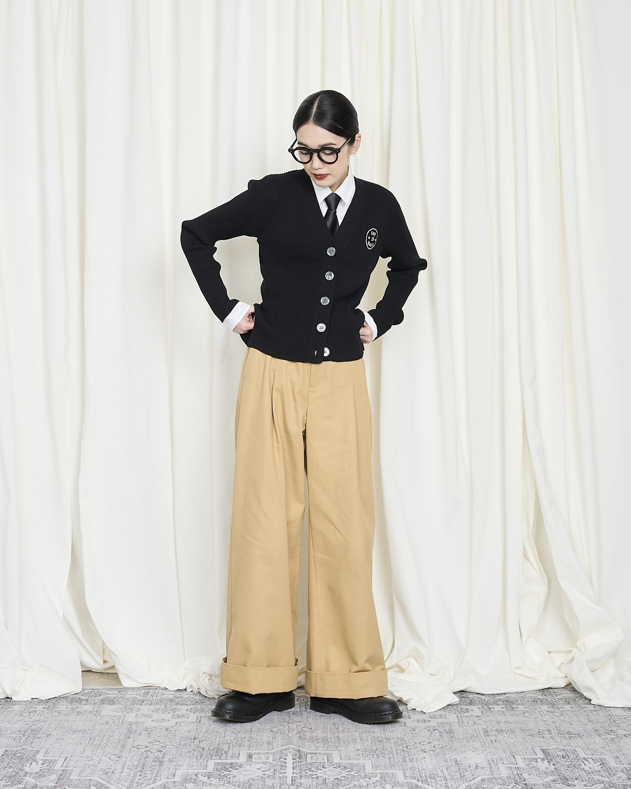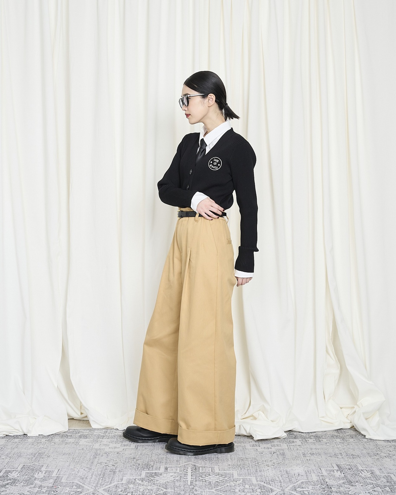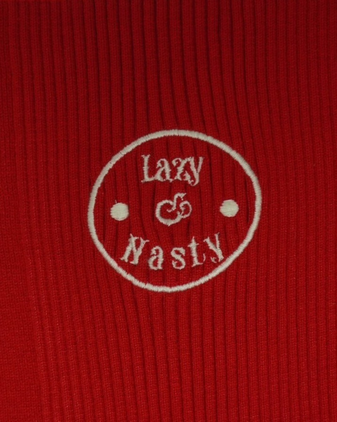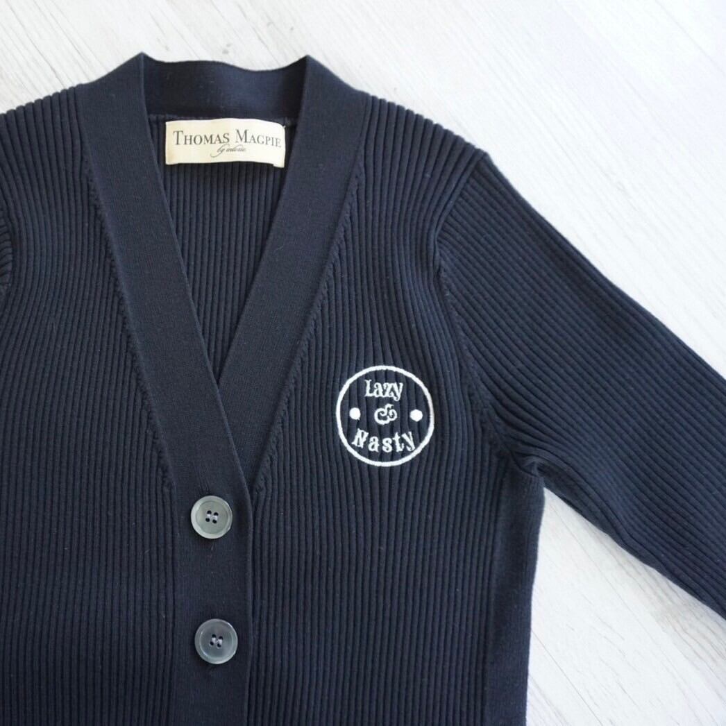 今回はレイジーアンドナースティ。ぐうたらで、家ではやりたい放題の女の子。でも外ではしっかり仕事を遂行できるオンオフのスイッチ変換ができるアンバランスな女の子を想定しました。だらしなさとは裏腹にオンタイムの日に着用するキレイめのニットのイメージです。オフィスで着るのにふさわしいけれど、ロゴにはLAZY AND NASTYのロゴマークが入ります。だらしなさ全開のロゴになっています。(ご注意ください) 着丈はやや短め、腰ハリさんには着にくくないようにサイドにスリットを入れてバランスを取りやすくしています。リブは少し太めでラインが出てほっそりと見える効果があります。お勧めはブラックです。無彩色でビジネスシーンにも合わせやすく便利かもしれません。セーラーカラーの襟に合わせて着る事ができます。またインナーにTシャツを入れても合わせやすくしています。トーマスマグパイの中では少し新鮮なシルエットで夏の終わりから秋にかけて使えるアイテムだと思います。
