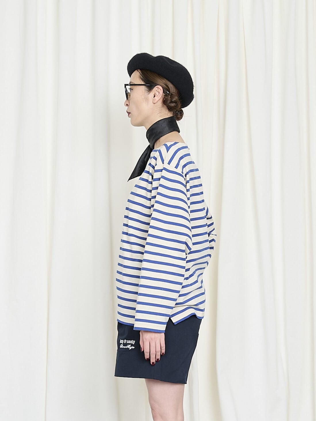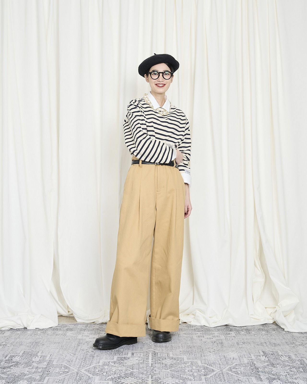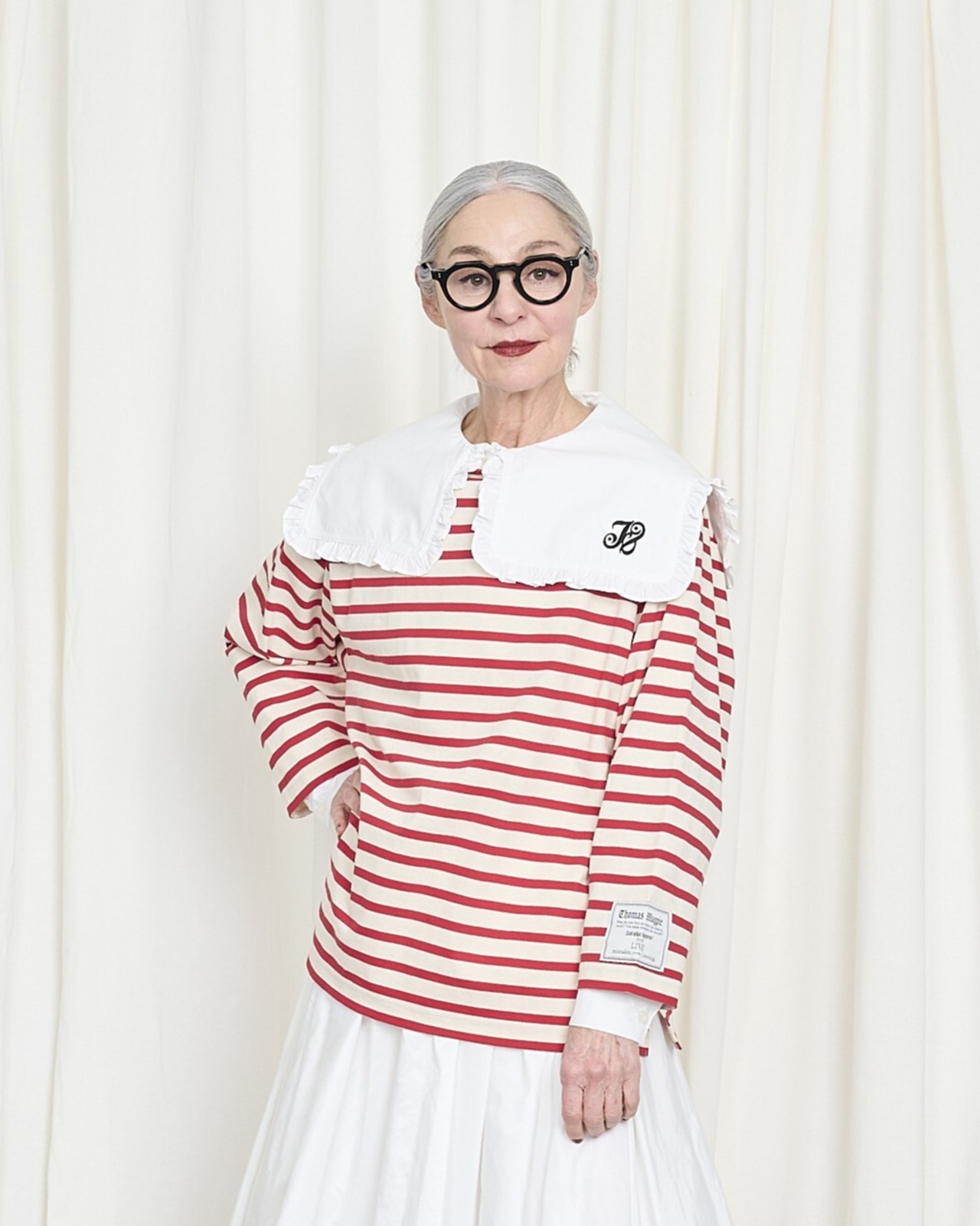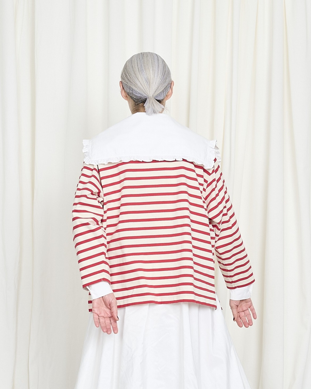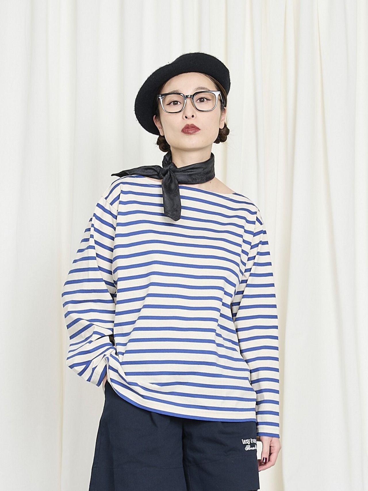 定番的に使えるシンプルなTシャツ。今回のボーダーは身頃が大きめ、袖は短め、着丈は長めで、どんな体型の方にも合わせやすいサイズ感にしてみました。身頃がかなり大きめなので、インナーにシャツを入れて着るのが今の気分にふさわしい気がしています。なので袖丈はやや短めの8部袖。シャツの袖を出してたくし上げて着ても良いかもきしれません。レッドとブラックの2色展開です。注目の高かったのはレッドです。定番的にはブラックがお勧めです。(限りなくブラックに近い、ダークネイビーのような色味です)私は今回はレッドを着たくて作りました。着てみるとやはり、身頃の大きめのサイズ感がとても良かったです。ボーダーTはいくつも持っていますが、今回はサイズ感が大変気に入っています。ぜひ色々なシャツを入れて着てみてください。ちょっと今年らしい流行のスタイルにできるかもしれません。