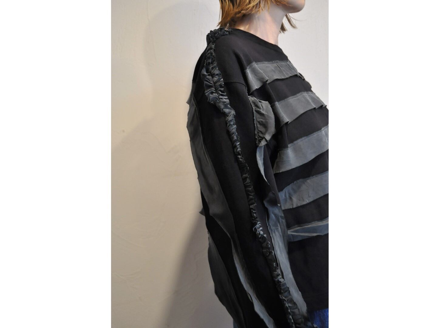●ゆったりとしたビッグシルエットのロンTに、柔らかなキュプラ素材でボーダー状のパッチワークを施した立体的なボーダーロンTです。