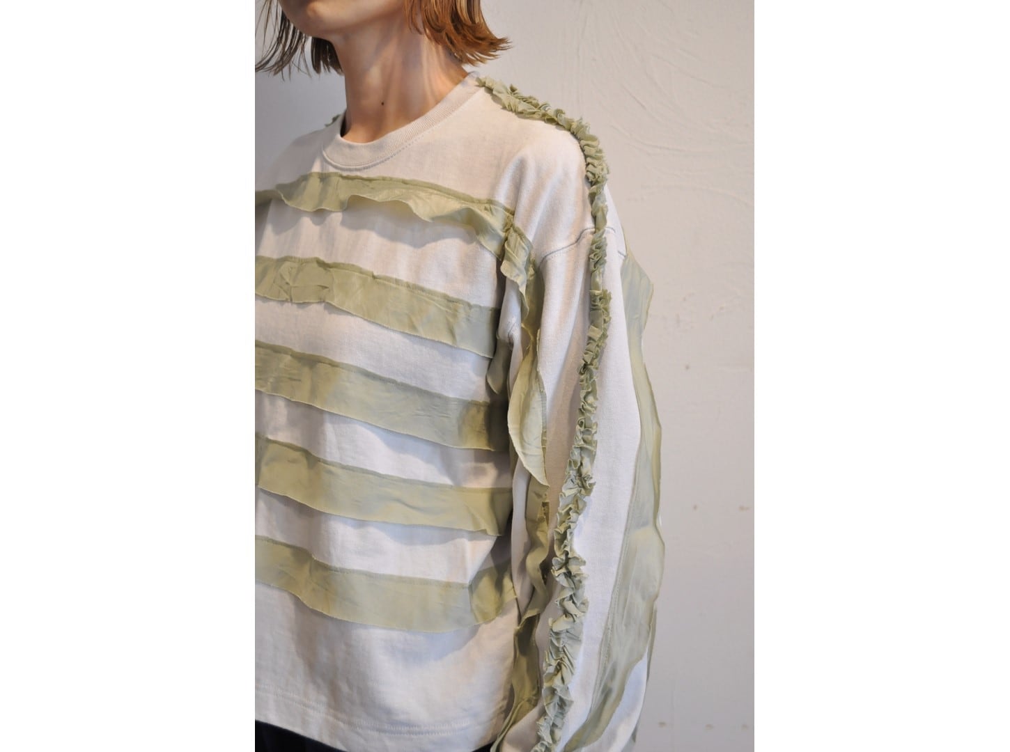 ●ゆったりとしたビッグシルエットのロンTに、柔らかなキュプラ素材でボーダー状のパッチワークを施した立体的なボーダーロンTです。