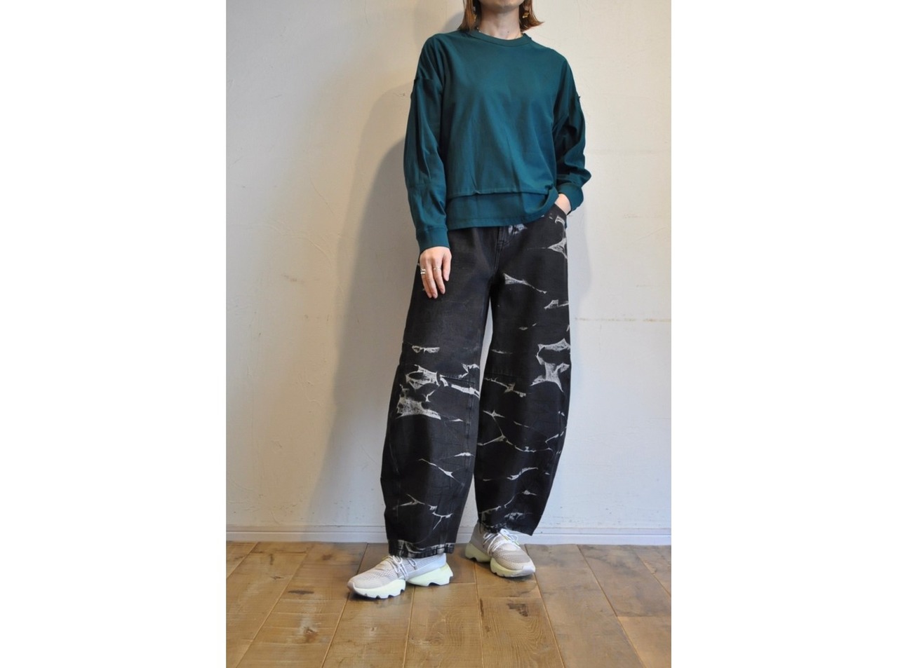 切りっぱなしの裾の剥ぎやバックタグがデザインポイント。