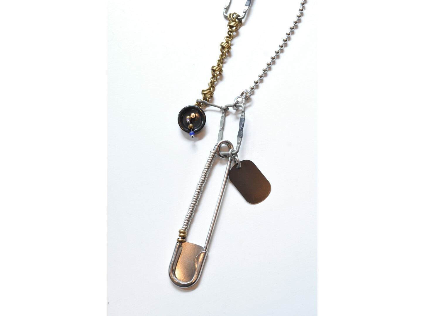 太めのボールチェーンとヴィンテージボタンやメタルパーツを使用したインパクトのあるアクセサリー。