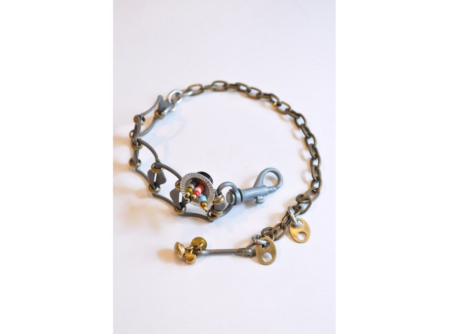 ミリタリーバックルなどの色々なメタルパーツを組み合わせた存在感のあるブレスレット。