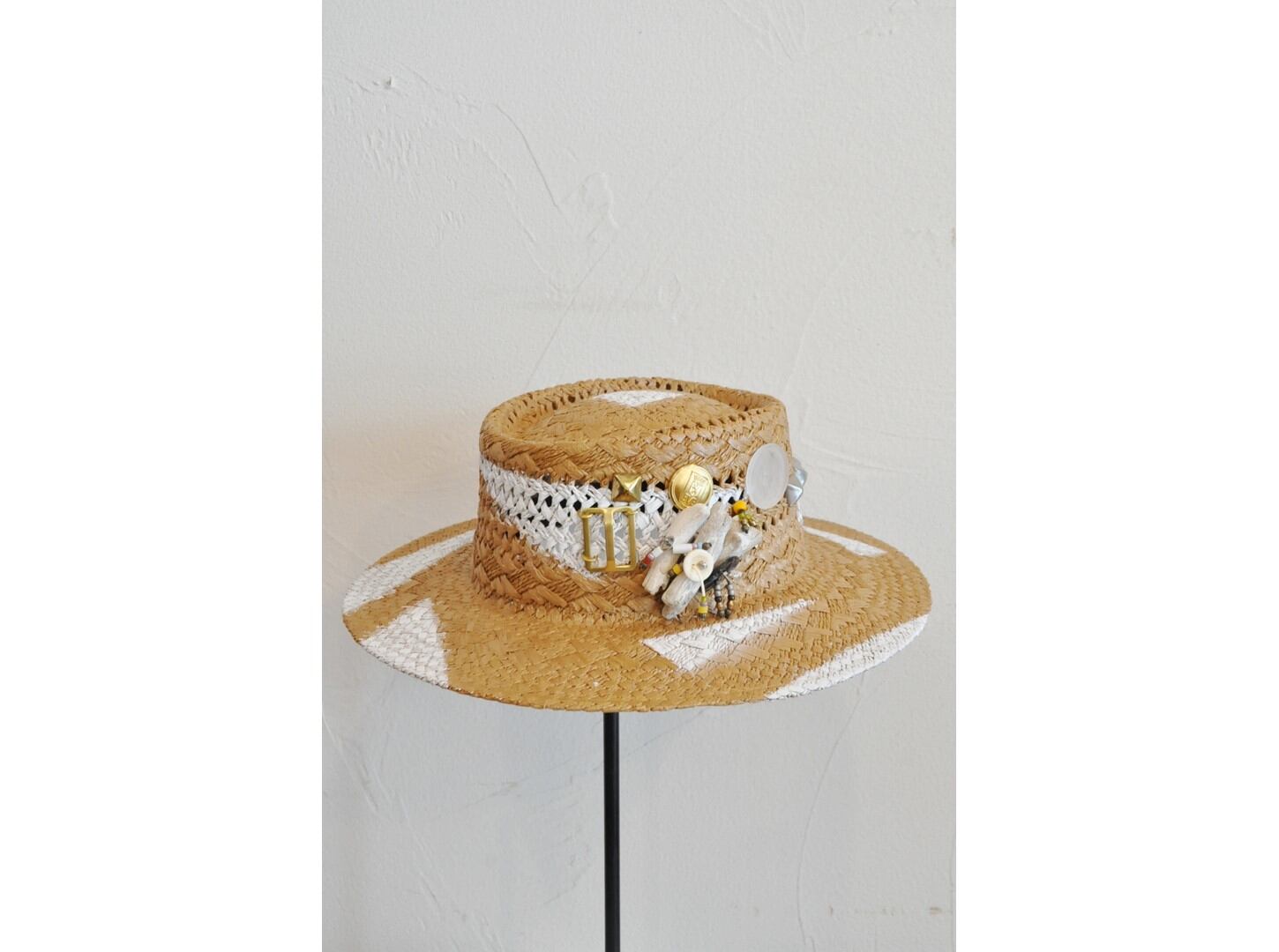 ●ヴィンテージのメタルパーツやボタン、ビーズ等を装飾に用いた一点物のストローハット。
