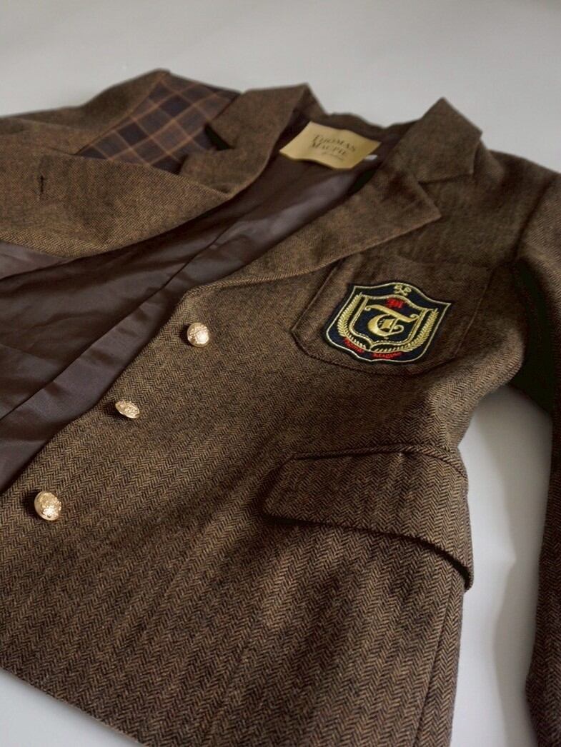 フロント胸にはオリジナルのブランドロゴ入りのエンブレムを付けています。トラッド感の強いデザインで、ブラウンもグレーもチェックとの組み合わせで少し変わった雰囲気を醸します。ビジネスシーンでもオフィスカジュアルがOKなお仕事であれば、とてもお勧めです。スカートスタイルに非常に重宝する冬の暖かなジャケット。上からコートを羽織るのにもストレスのないコンパクトさです