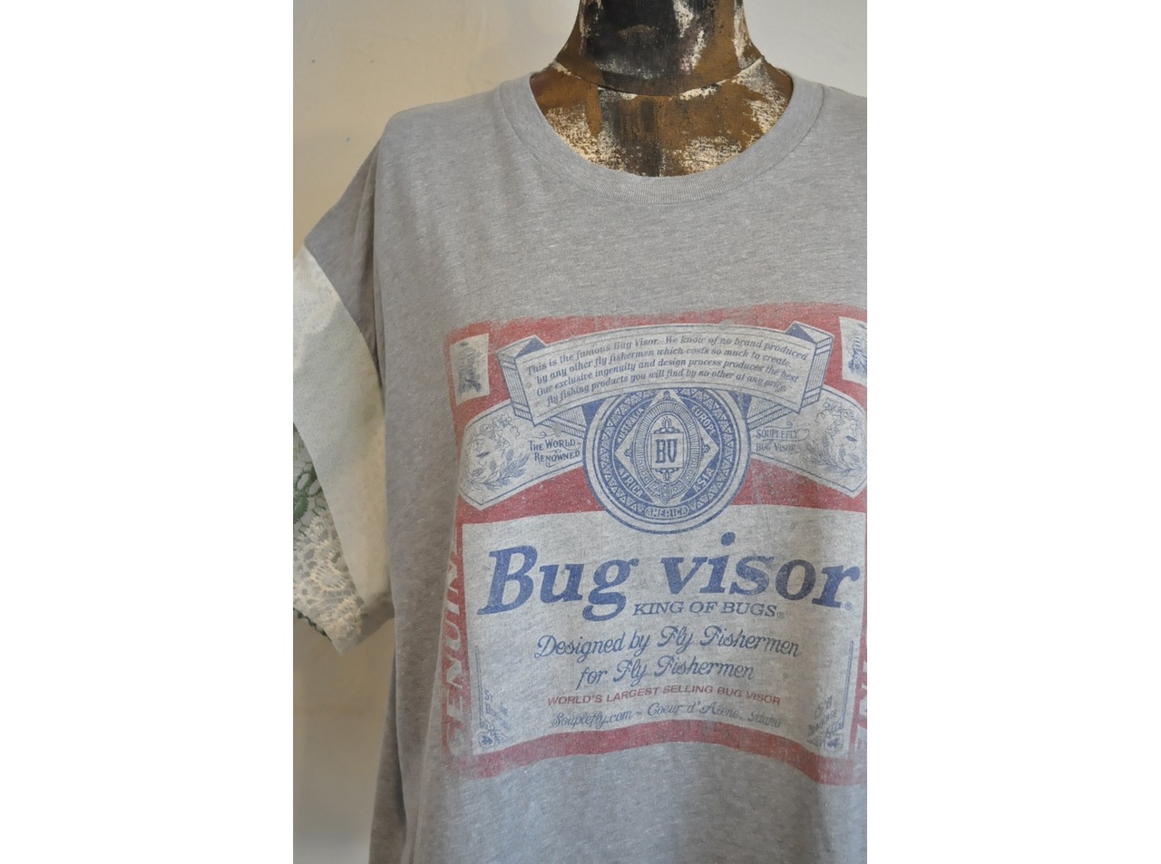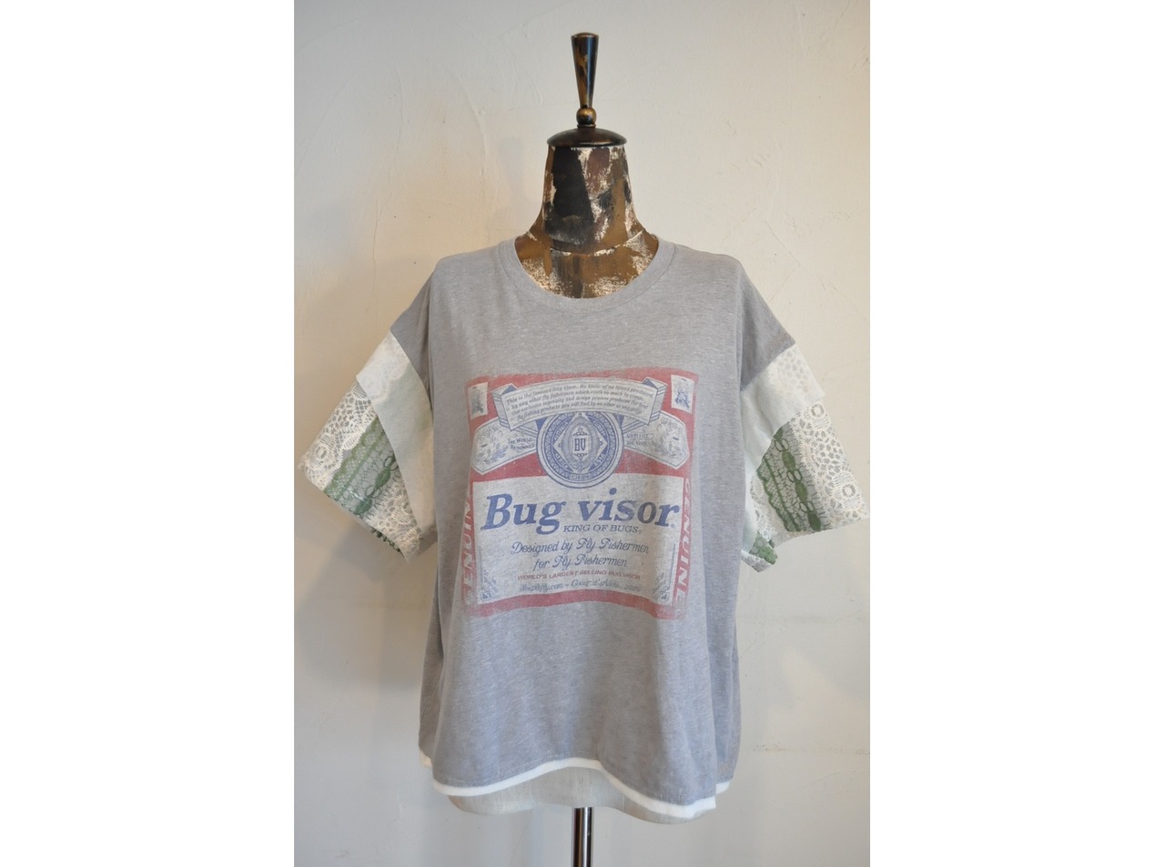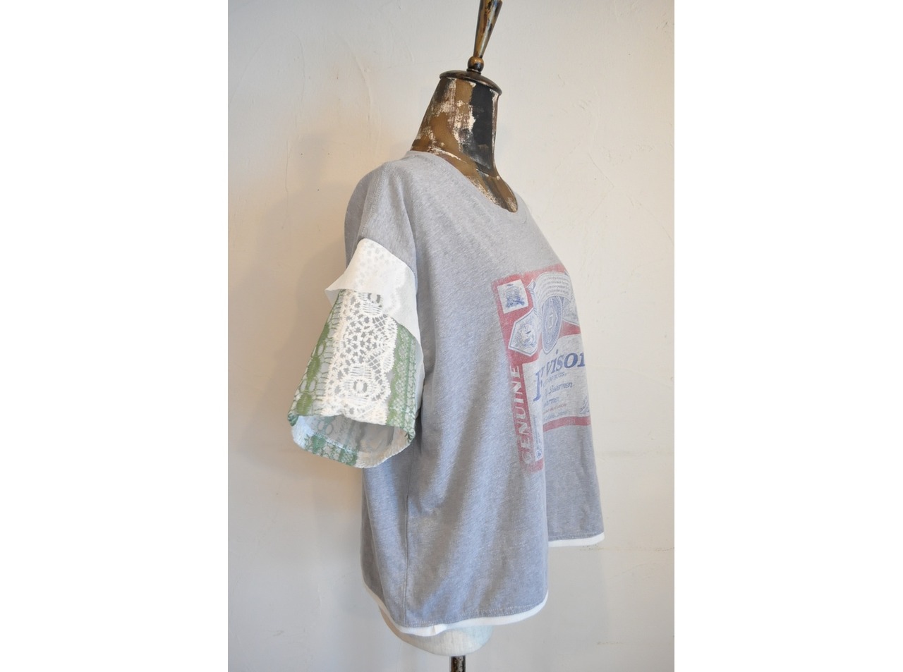 ●ユーズドTシャツの可愛いプリントの物をセレクトし、それぞれに合った色の相性を考え、レースで作った袖を取り付けた1点物のTシャツ。