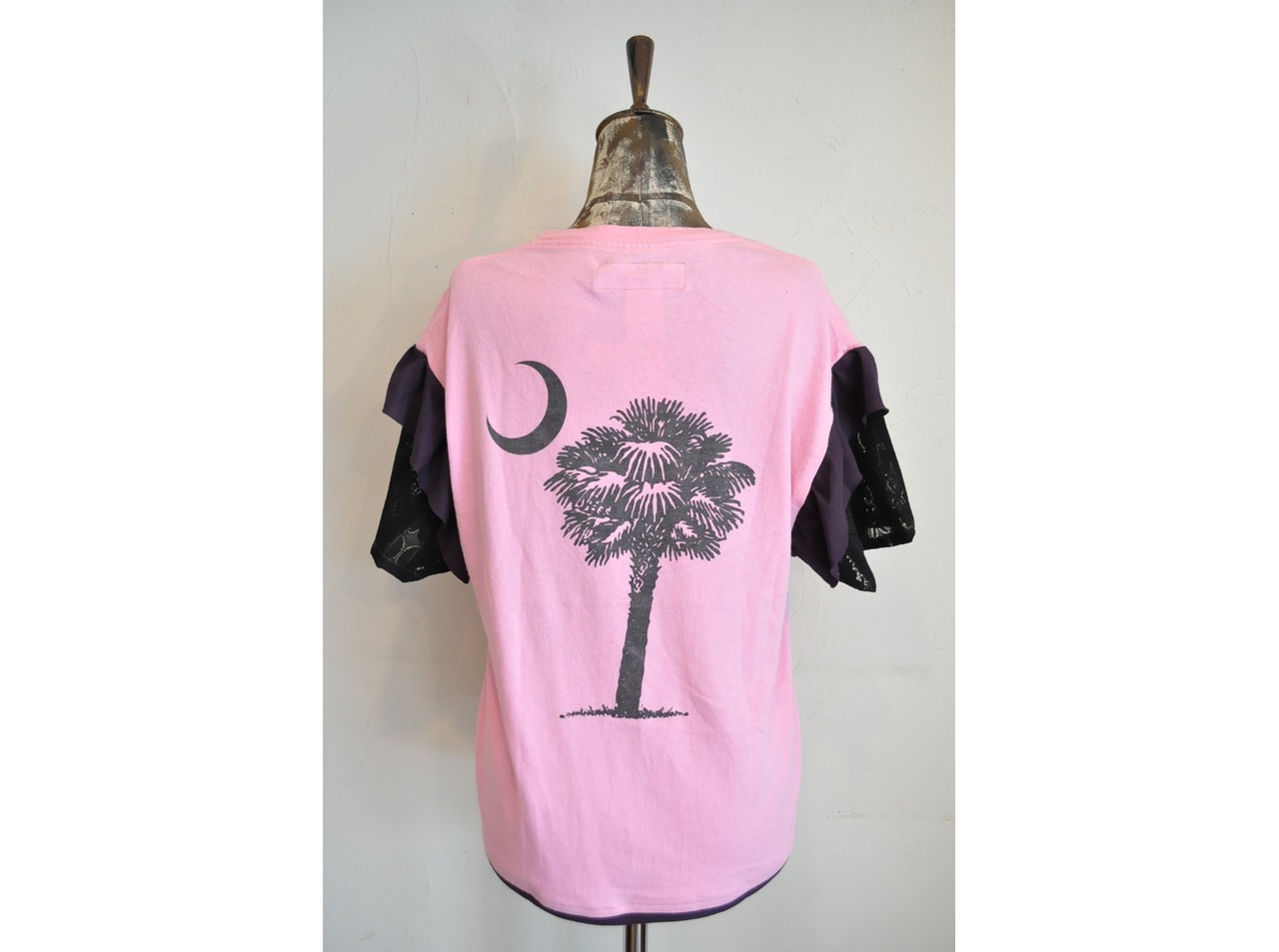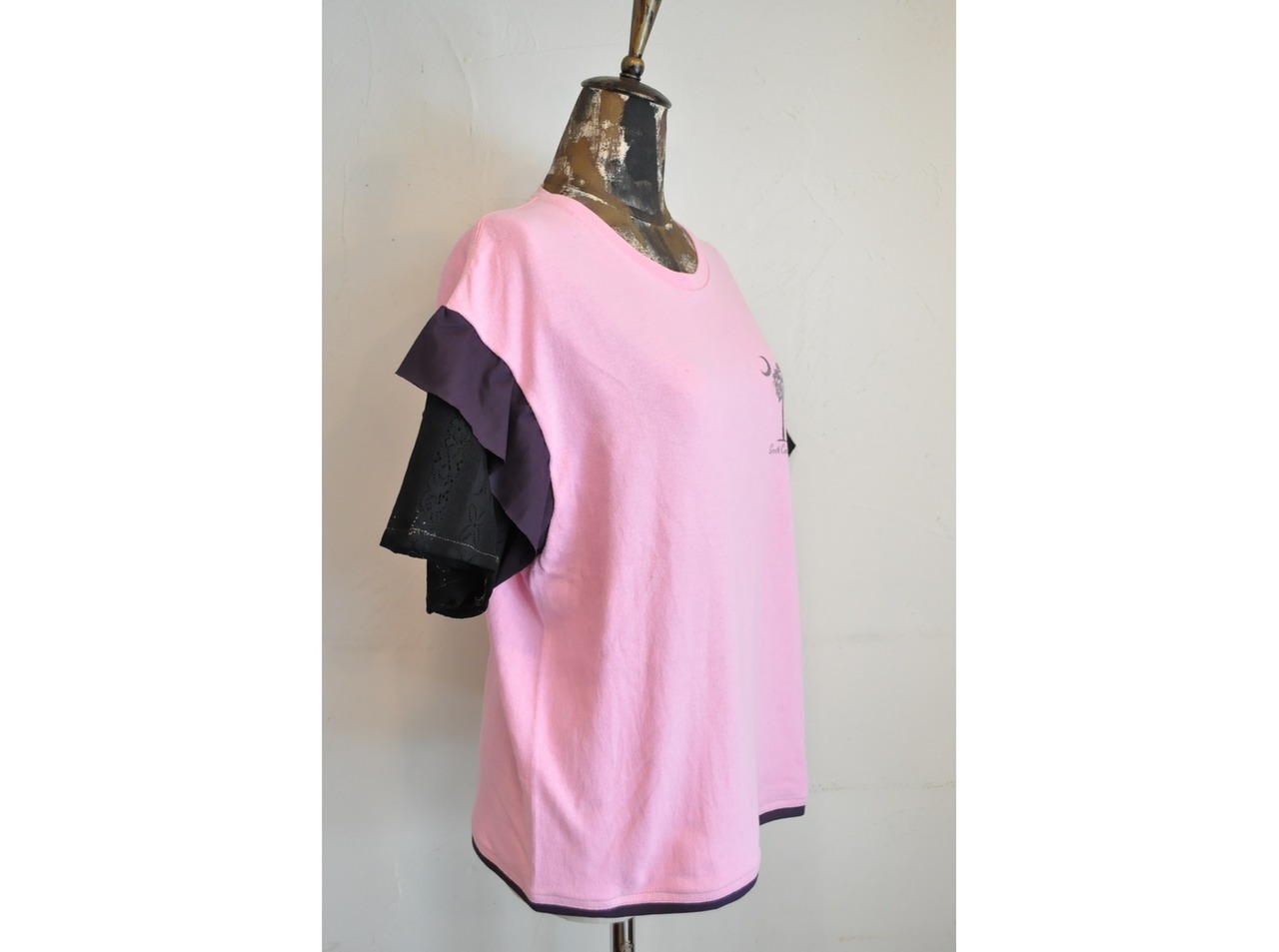 ●ユーズドTシャツの可愛いプリントの物をセレクトし、それぞれに合った色の相性を考え、レースで作った袖を取り付けた1点物のTシャツ。