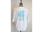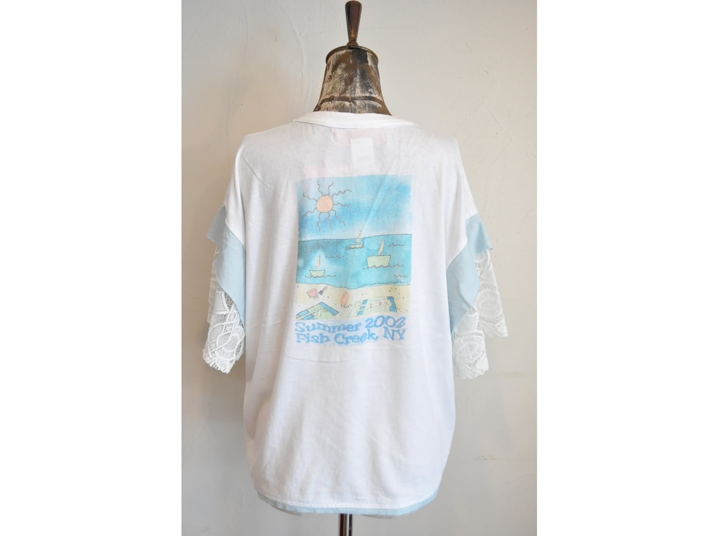 ●ユーズドTシャツの可愛いプリントの物をセレクトし、それぞれに合った色の相性を考え、レースで作った袖を取り付けた1点物のTシャツ。