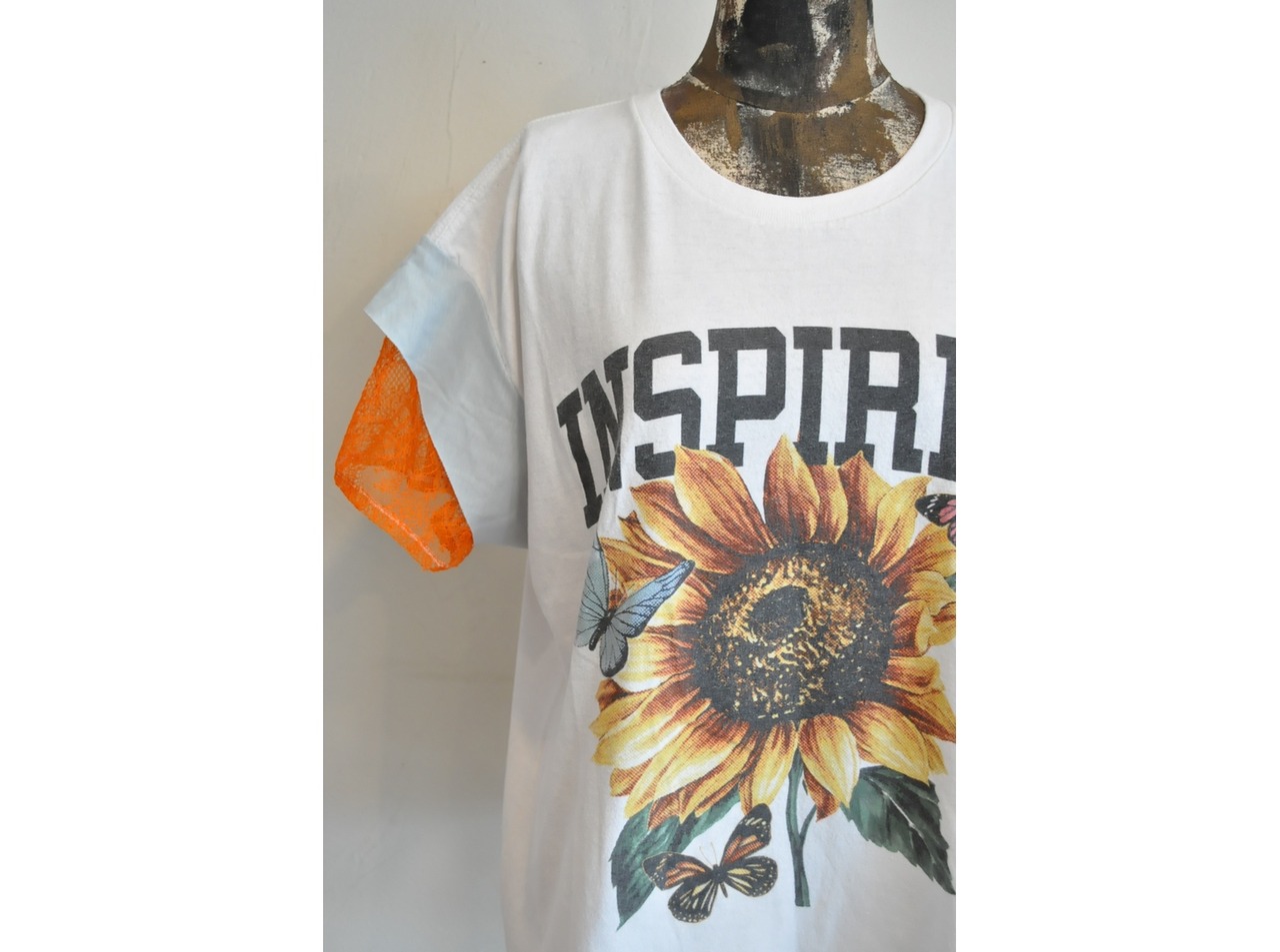 ●ユーズドTシャツの可愛いプリントの物をセレクトし、それぞれに合った色の相性を考え、レースで作った袖を取り付けた1点物のTシャツ。