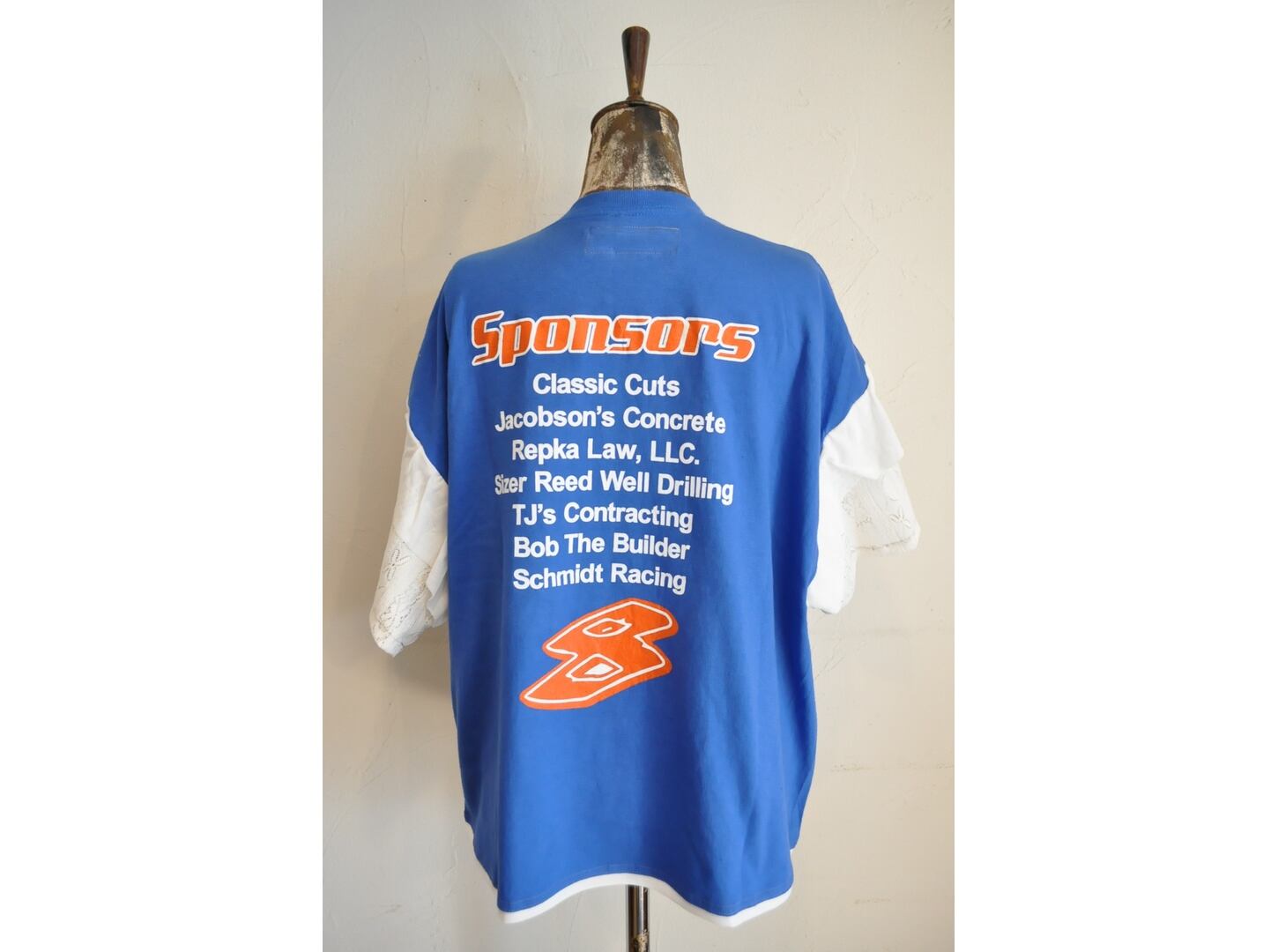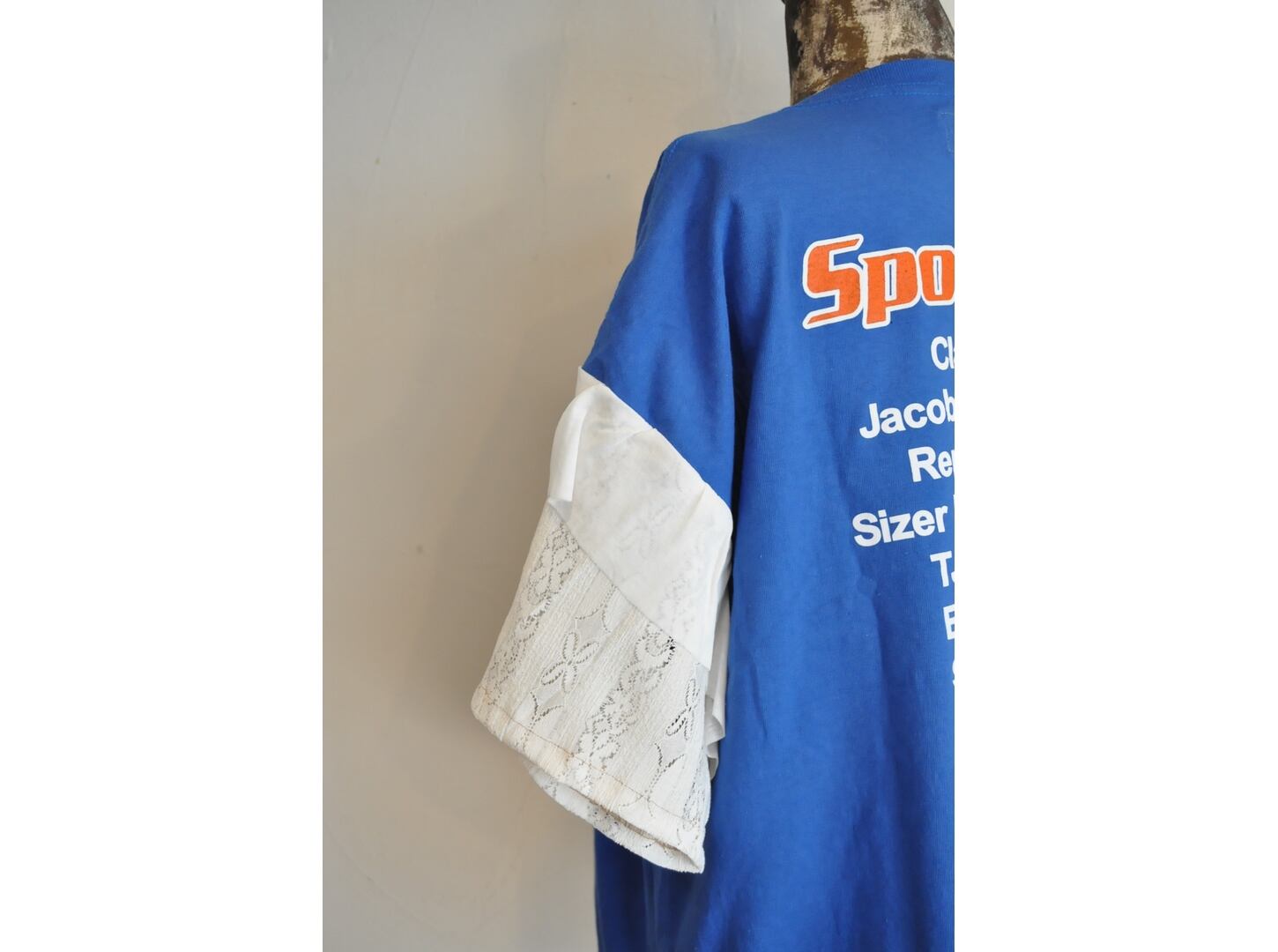 ●ユーズドTシャツの可愛いプリントの物をセレクトし、それぞれに合った色の相性を考え、レースで作った袖を取り付けた1点物のTシャツ。