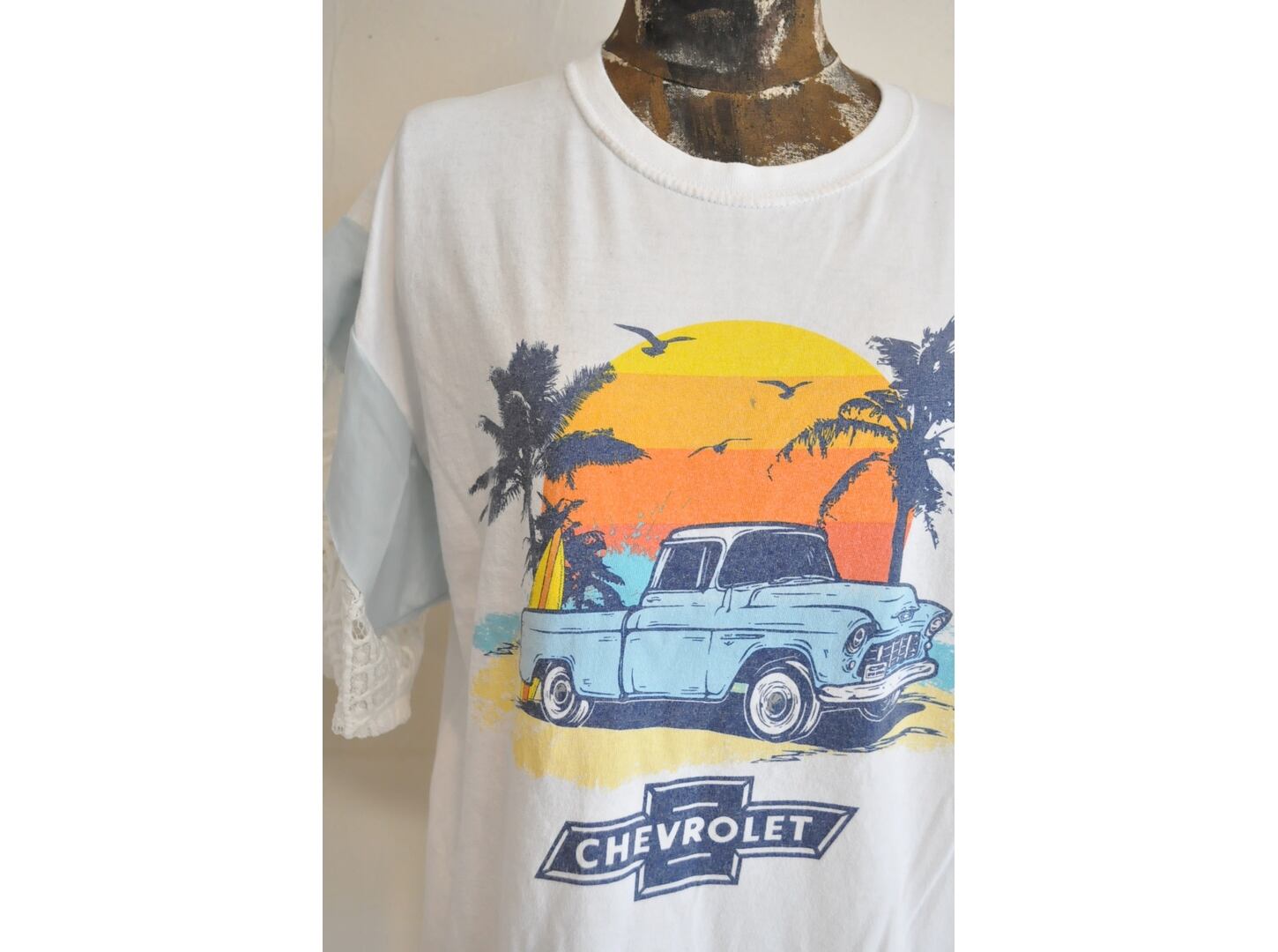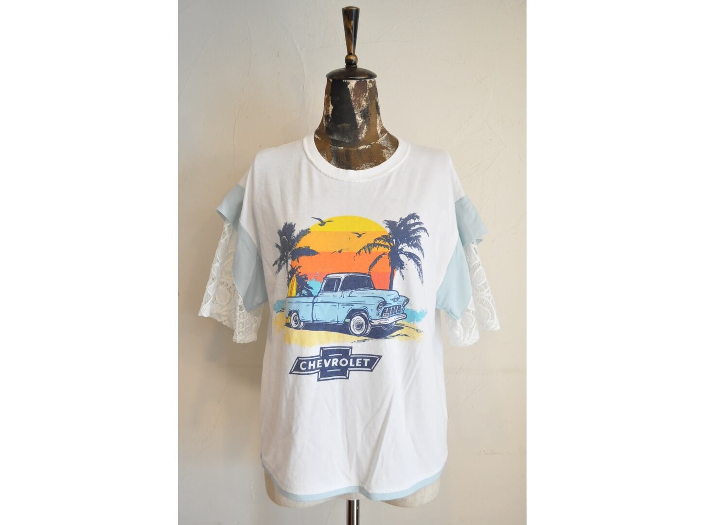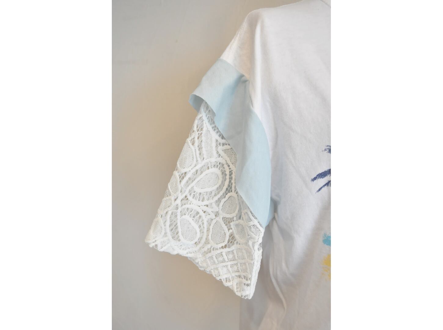 ●ユーズドTシャツの可愛いプリントの物をセレクトし、それぞれに合った色の相性を考え、レースで作った袖を取り付けた1点物のTシャツ。