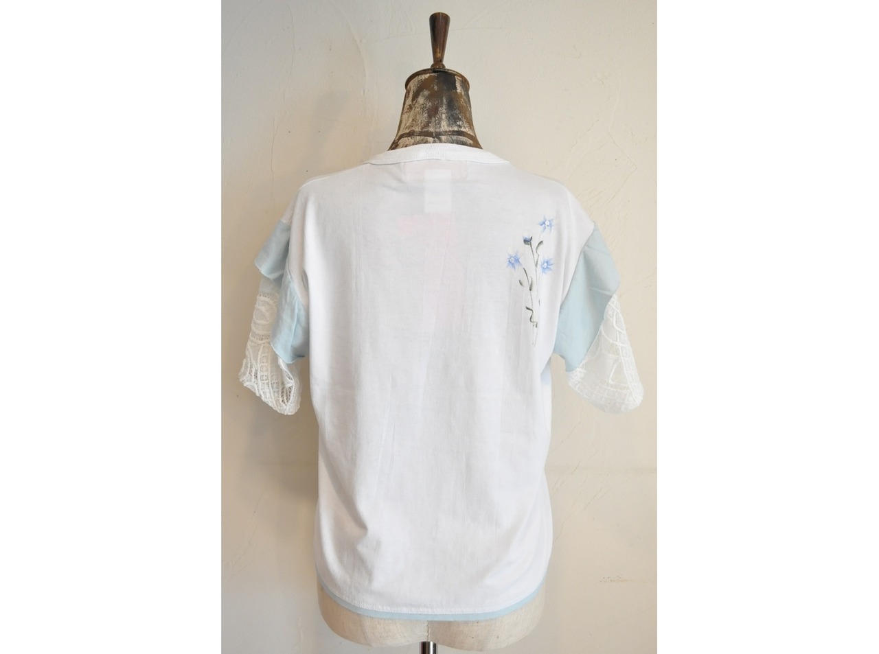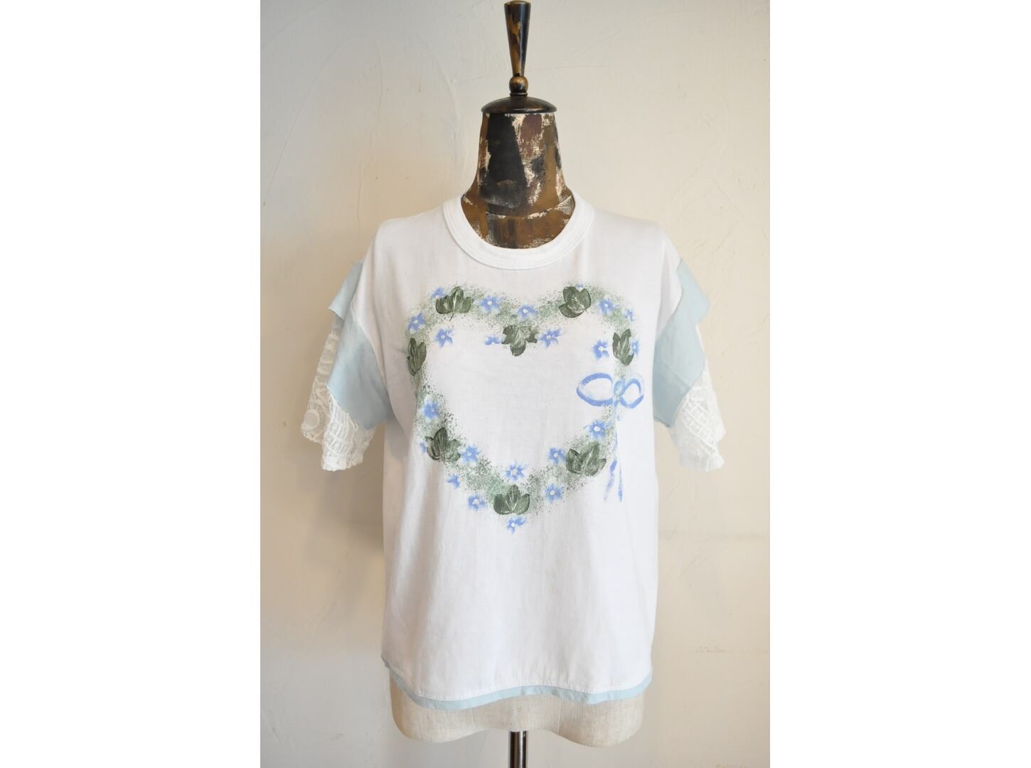 ●ユーズドTシャツの可愛いプリントの物をセレクトし、それぞれに合った色の相性を考え、レースで作った袖を取り付けた1点物のTシャツ。