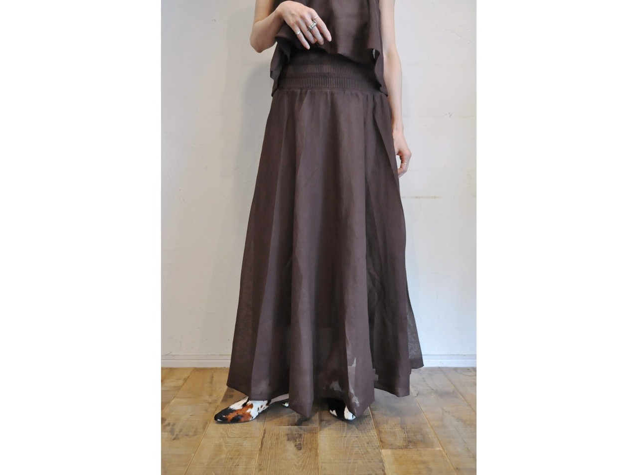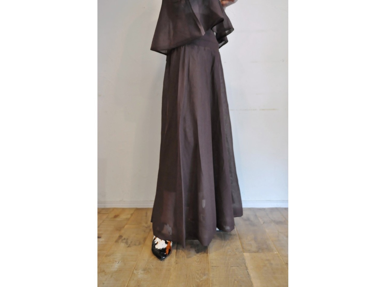 広がり過ぎないシアードレープが動くたびに軽やかに優雅に揺れて女性らしさが引き立つスカートです。
