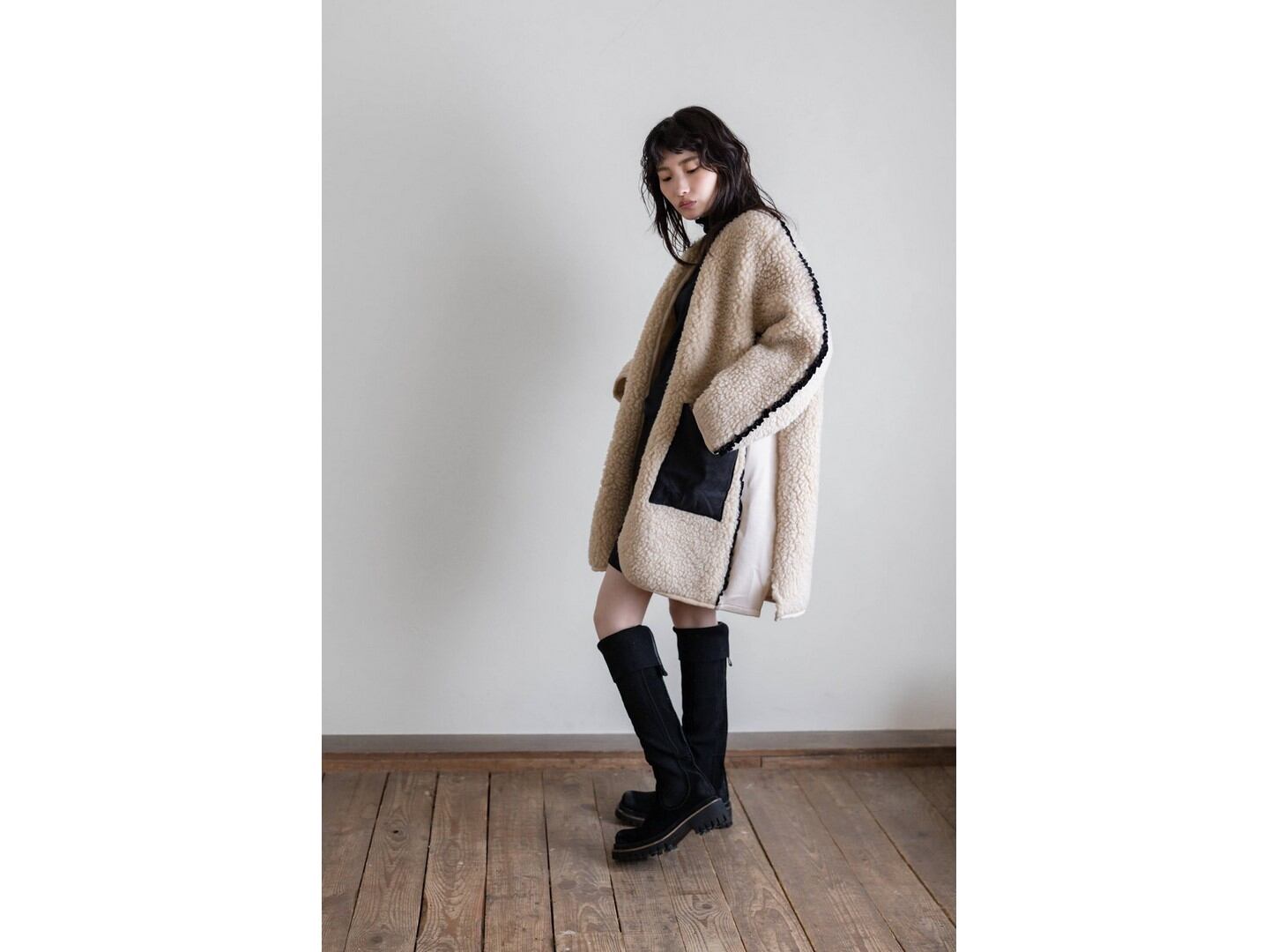 ウールボアコートをベースにリメイクし、フェイクスエードのパッチポケットがアクセント。