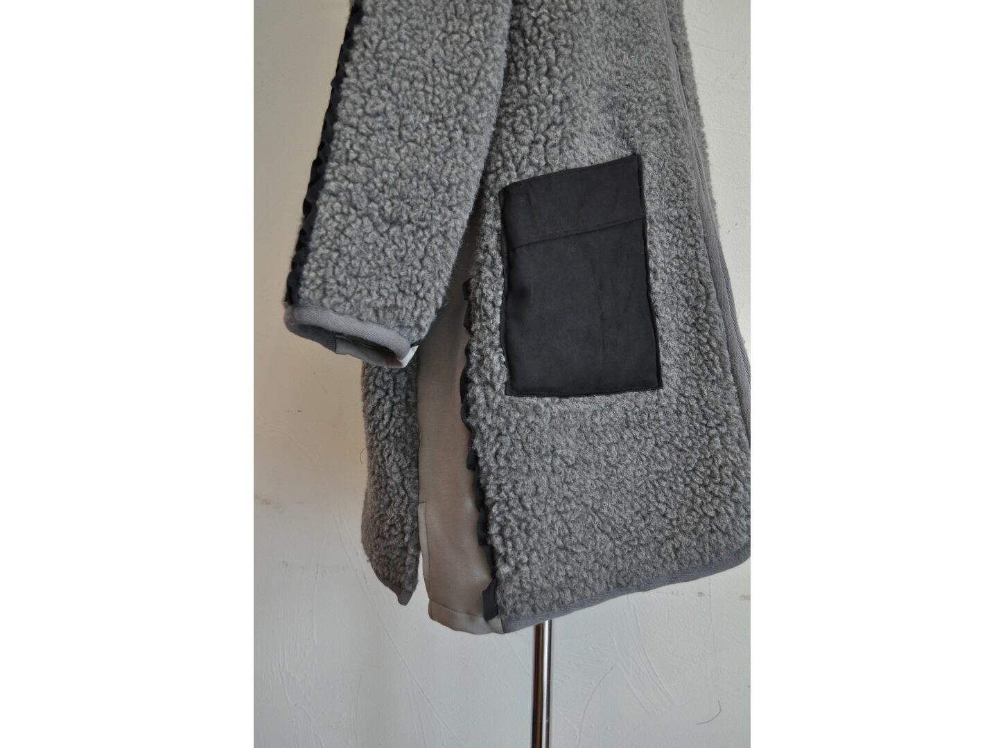 ウールボアコートをベースにリメイクし、フェイクスエードのパッチポケットがアクセント。