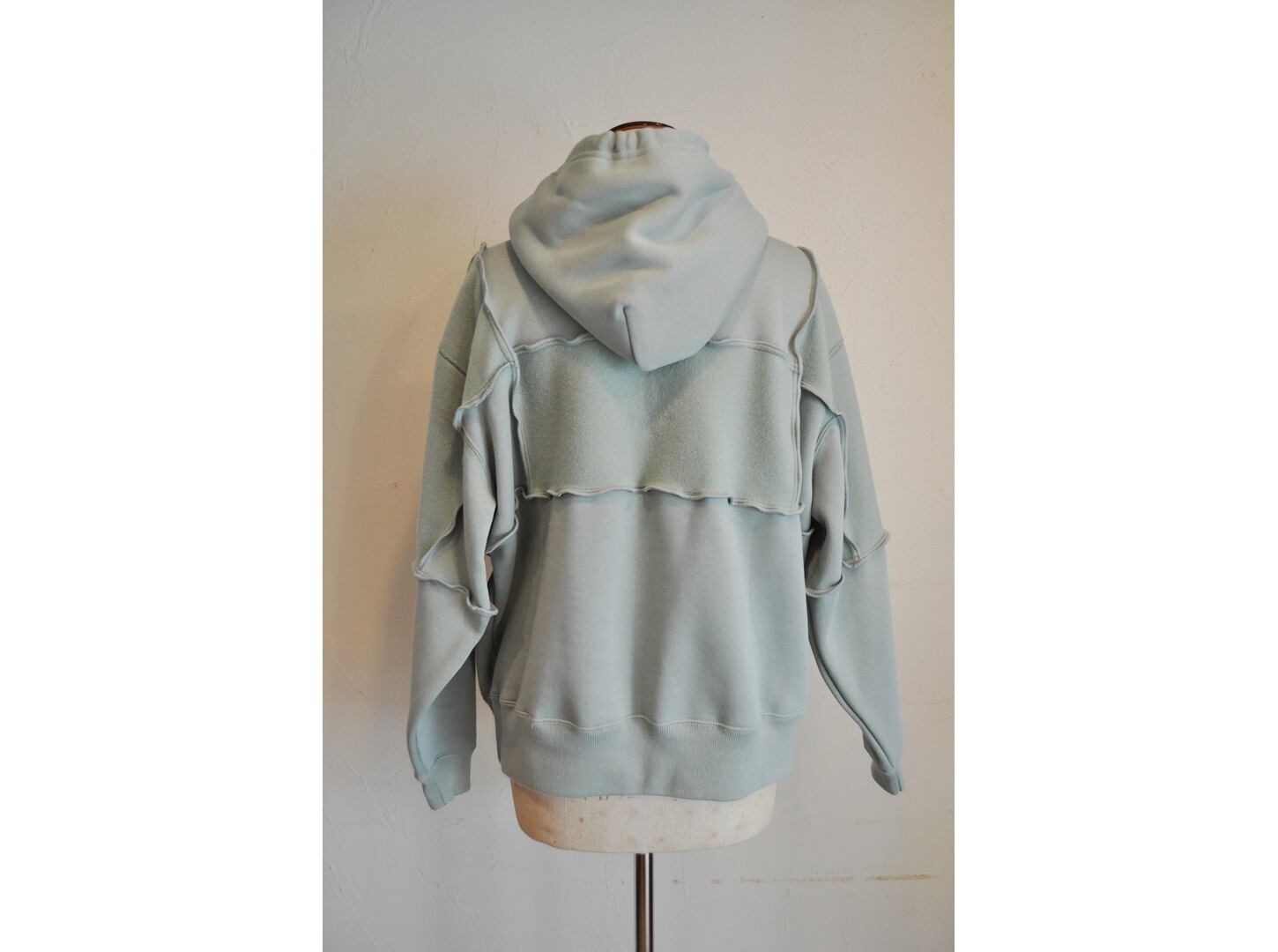 ●裏起毛のスウェットをパネルでカットし、表地と裏地が互い違いに組み合わされた、シンプルながらも立体感のあるパーカーです。