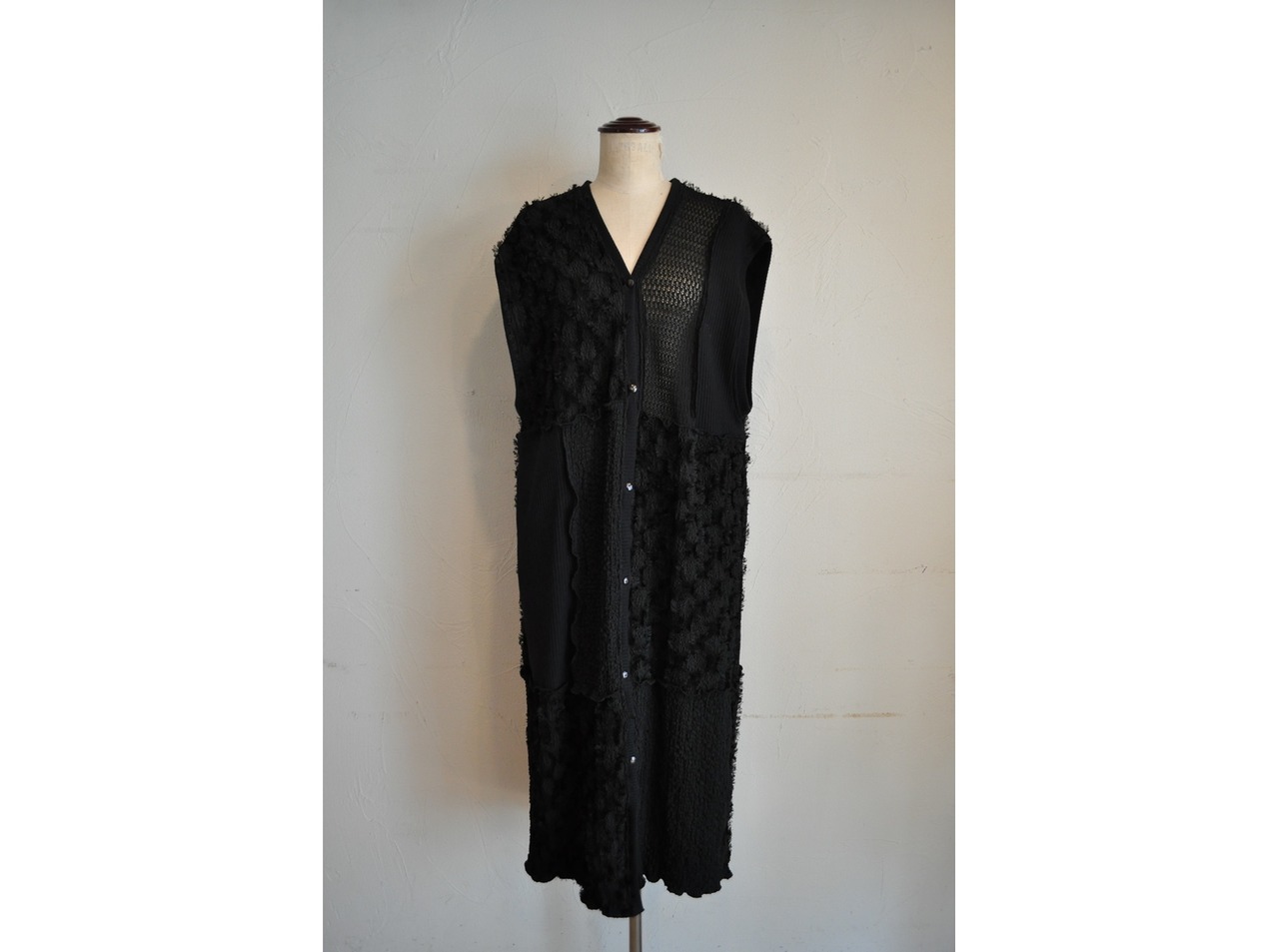 ●ざっくりとした編み地や凹凸のあるニット、リブ素材など、異なる表情のニットを組み合わせて仕立てたロングジレ。