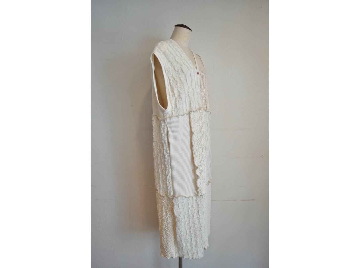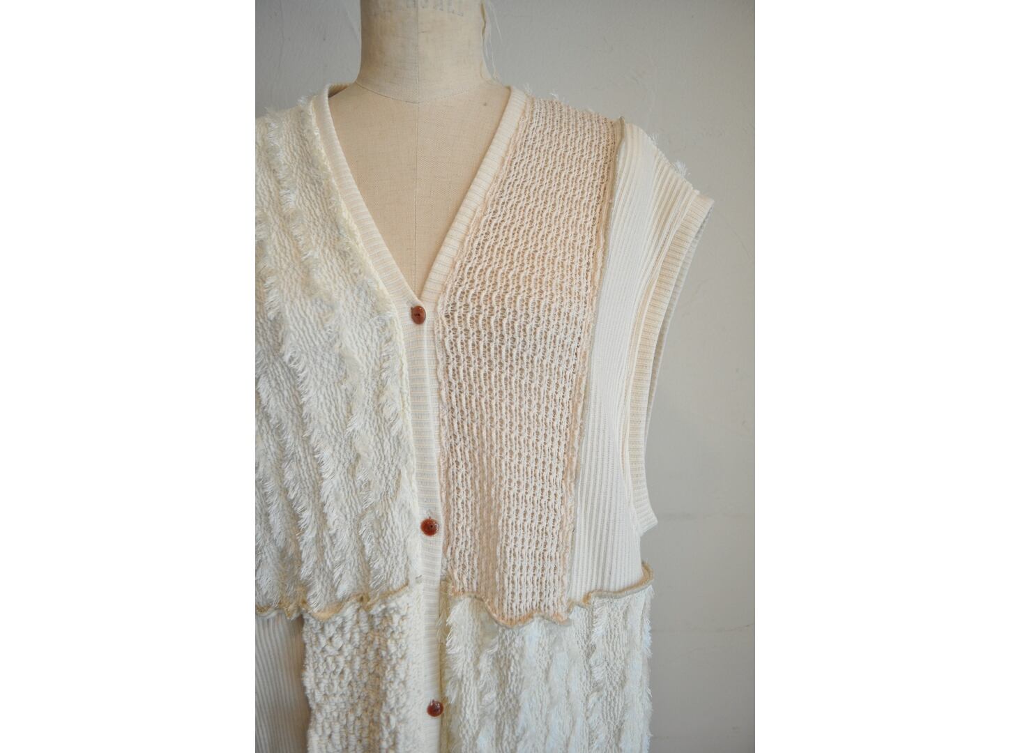 ●ざっくりとした編み地や凹凸のあるニット、リブ素材など、異なる表情のニットを組み合わせて仕立てたロングジレ。