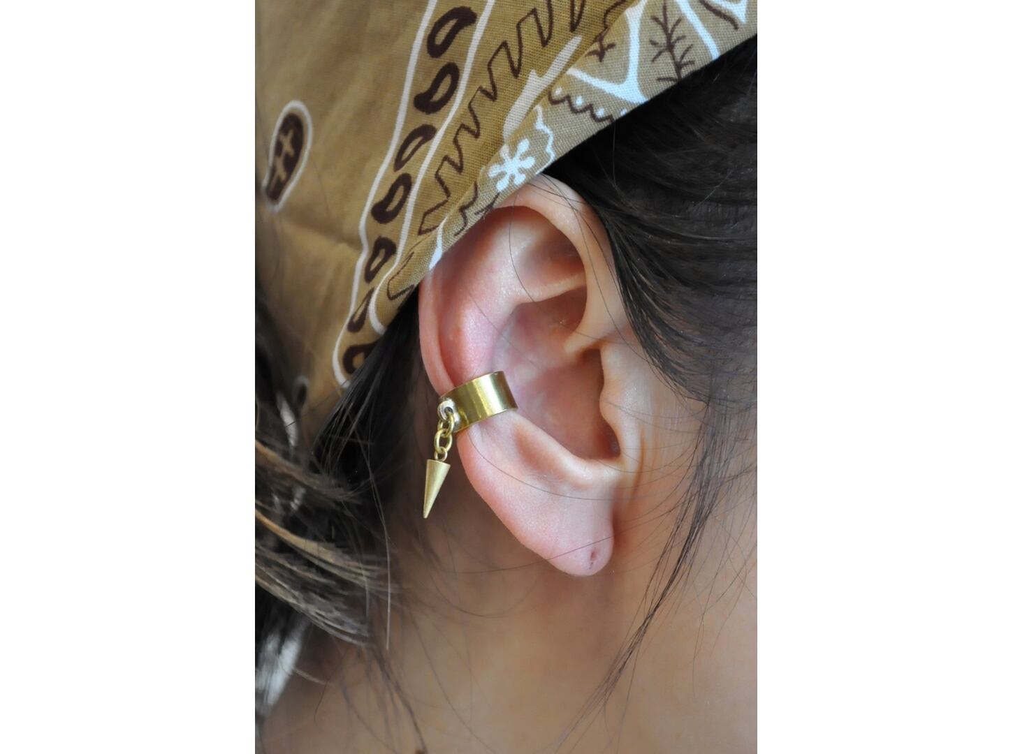 平打ちの厚めのプレートを土台に鋲のパーツをぶら下げて動きのあるイヤーカフに仕上がりました。