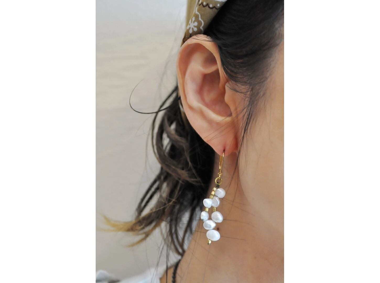 歪な淡水パールに小さい真鍮ビーズを入れ込んでデザインしました。