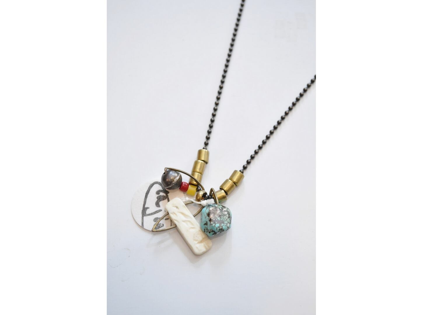 ●ヘッドに牛骨のアムレット(魔除け・お守り)を使用し、ヴィンテージのビーズやメタルパーツなどの色々な素材を組み合わせた独特な雰囲気のある一点物のネックレス。