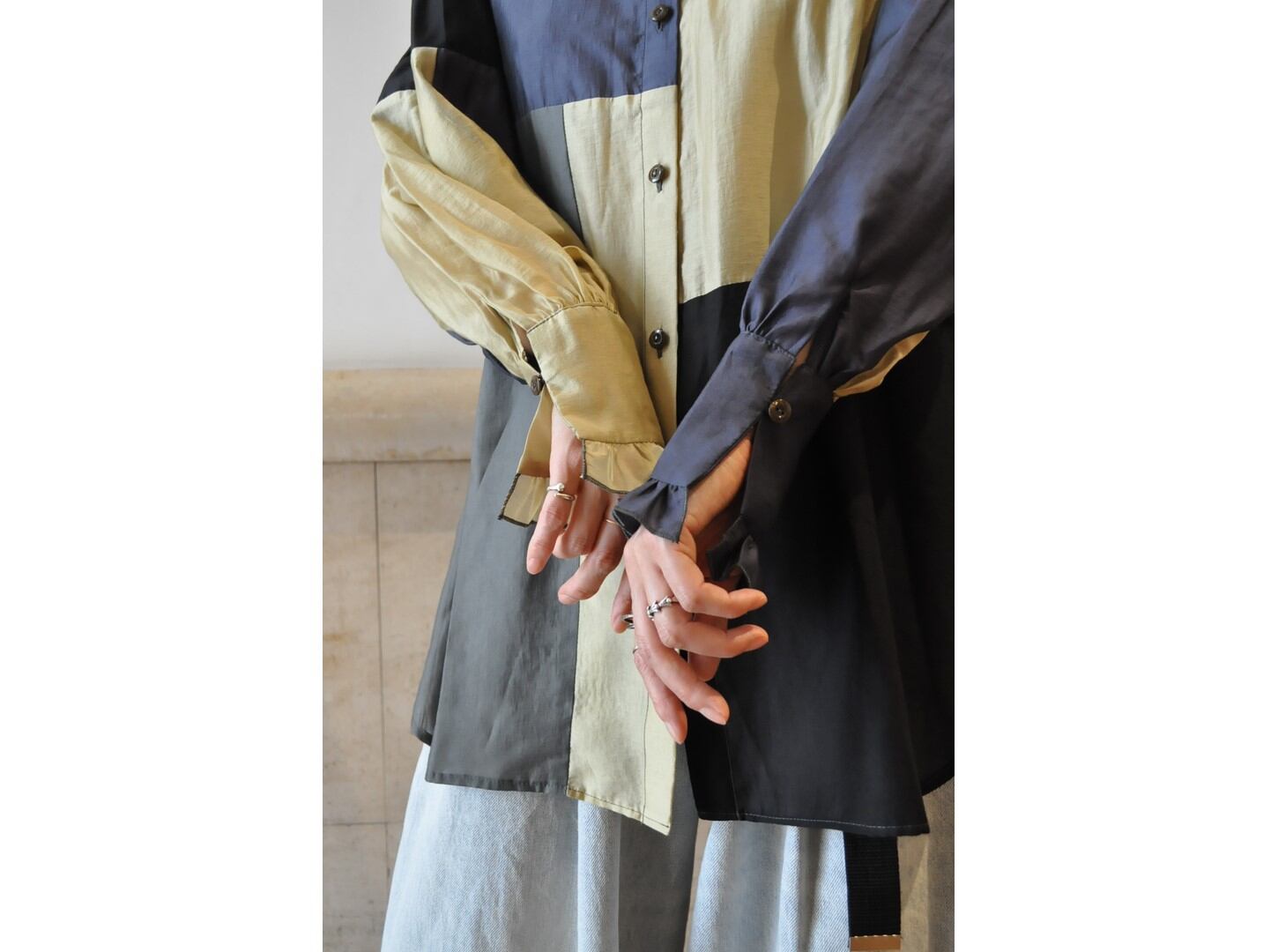 ●テンセル素材のサテンが生み出す、ソフトでしなやかな光沢が魅力のパッチワークブラウス。