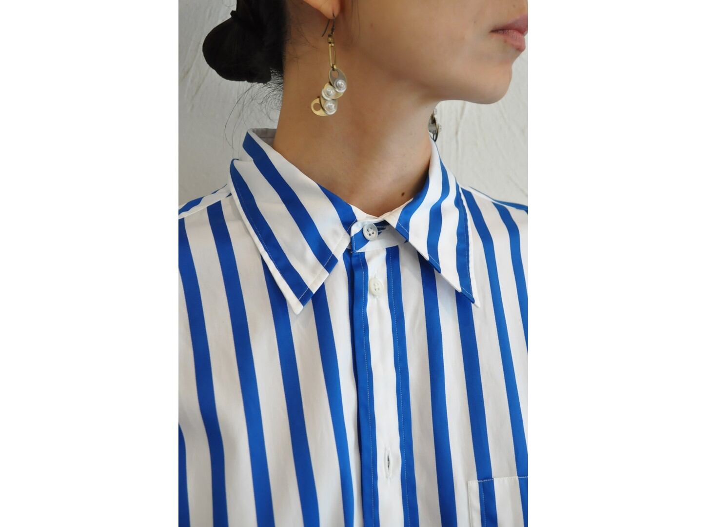 ●24針のステッチに袖口に深い2タックを入れ2枚袖で独自のフォルムを表現したストライプシャツ。