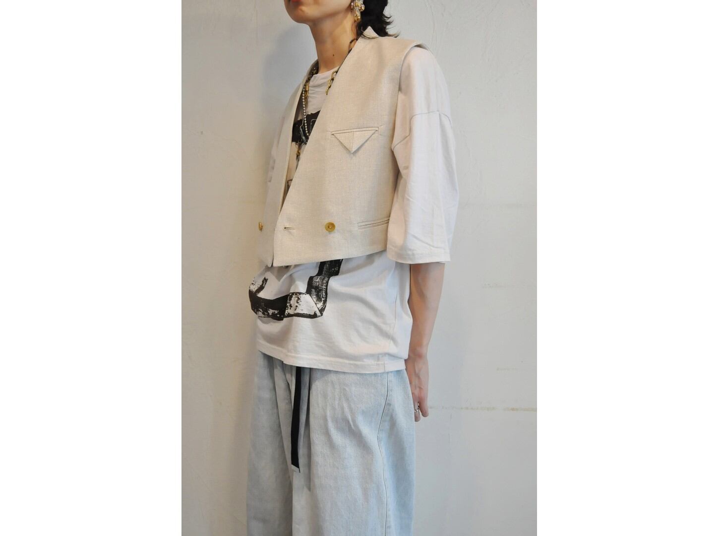 シンプルなショート丈のデザインに洗練された素材を落としこむことで個性的なベストに仕上がっています。