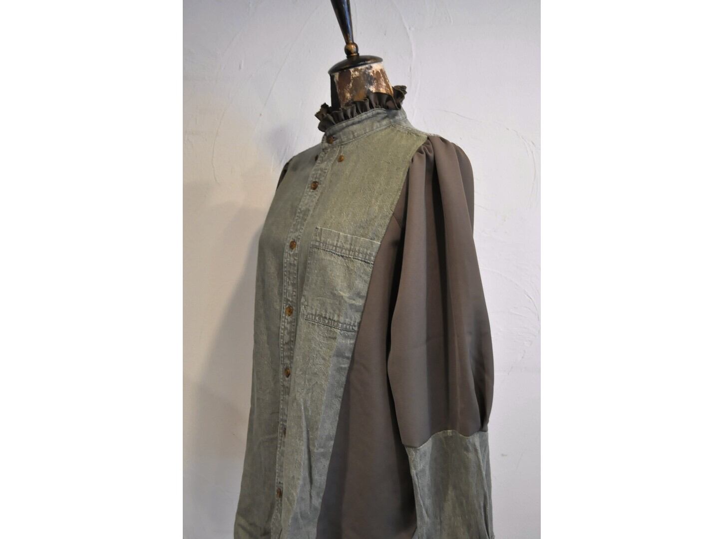 ●古着のシャツを解体し、パターンで構築したサイドパネルを挟み込んで作られたシャツ。