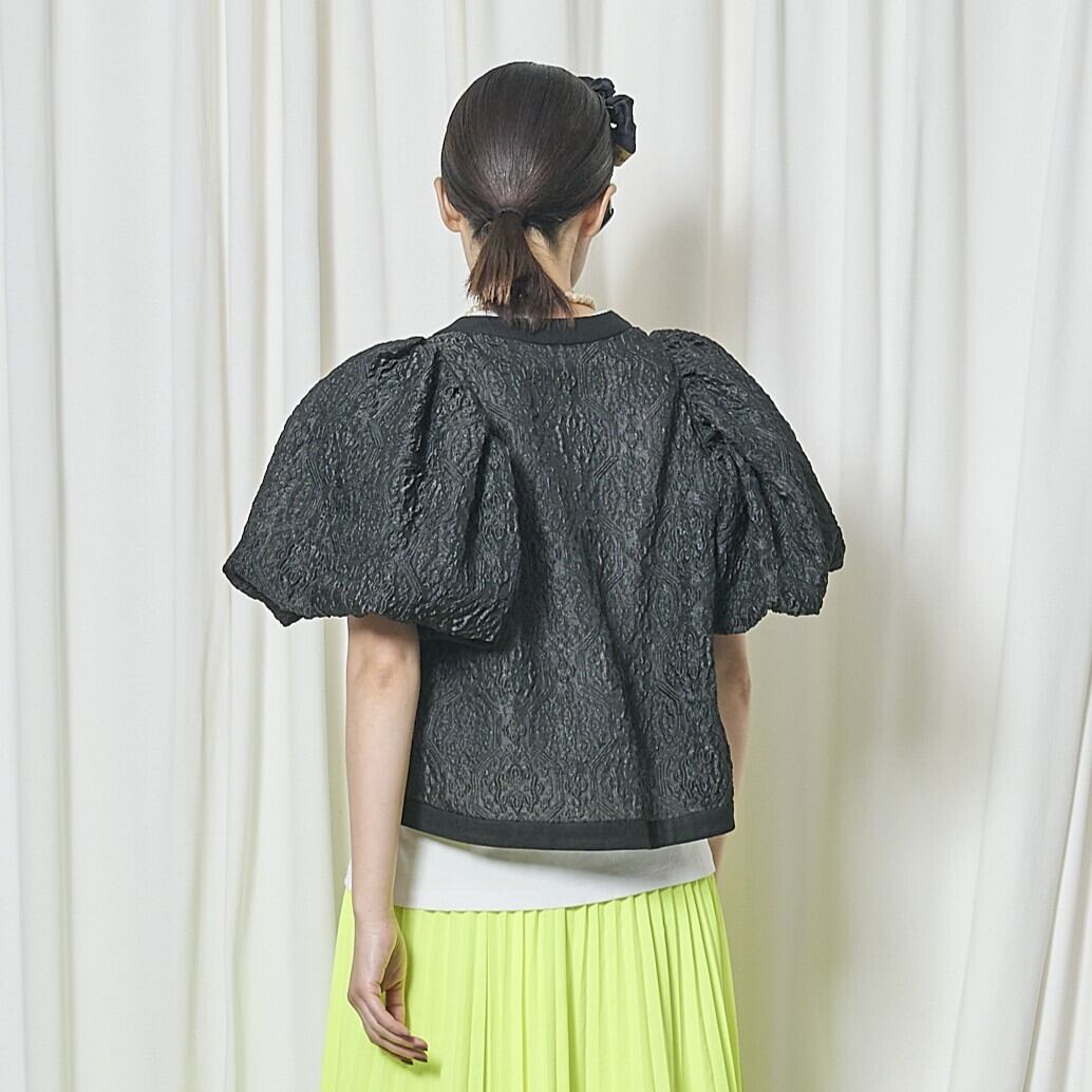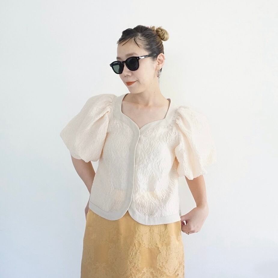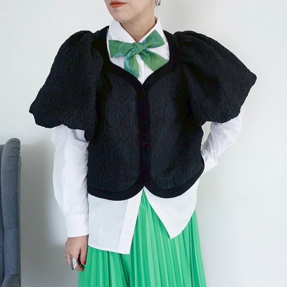 今回、ちょっと変わったジャケットをデザインしました。今までにないエンボス加工のシアー素材で、半袖パフスリーブのボレロ型ジャケットです。袖の膨らみのパターンと、ハリ感のある素材がベストマッチで、フワッと広がるパフスリーブ。このパフ具合の出来上がりはとても不安で仕方ありませんでしたが、パタンナーが可愛いシルエットに仕上げてくれました。とにかく気に入ったデザインで、オリジナリティのあるシルエットに仕上がっていると思います。ミニジャケットながら、両サイドにスラッシュポケット付きで、とにかく可愛いなと思います。