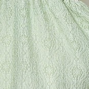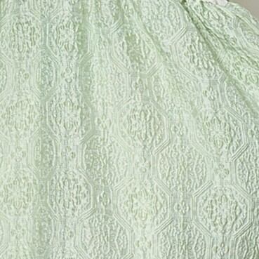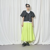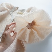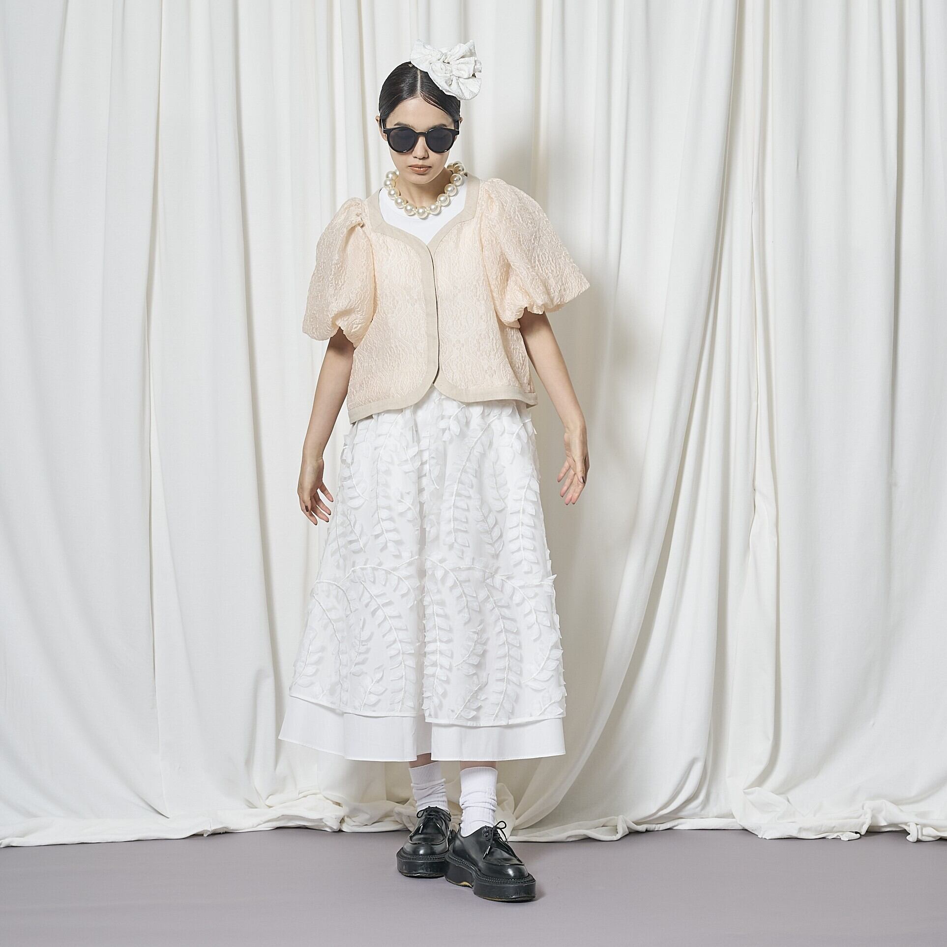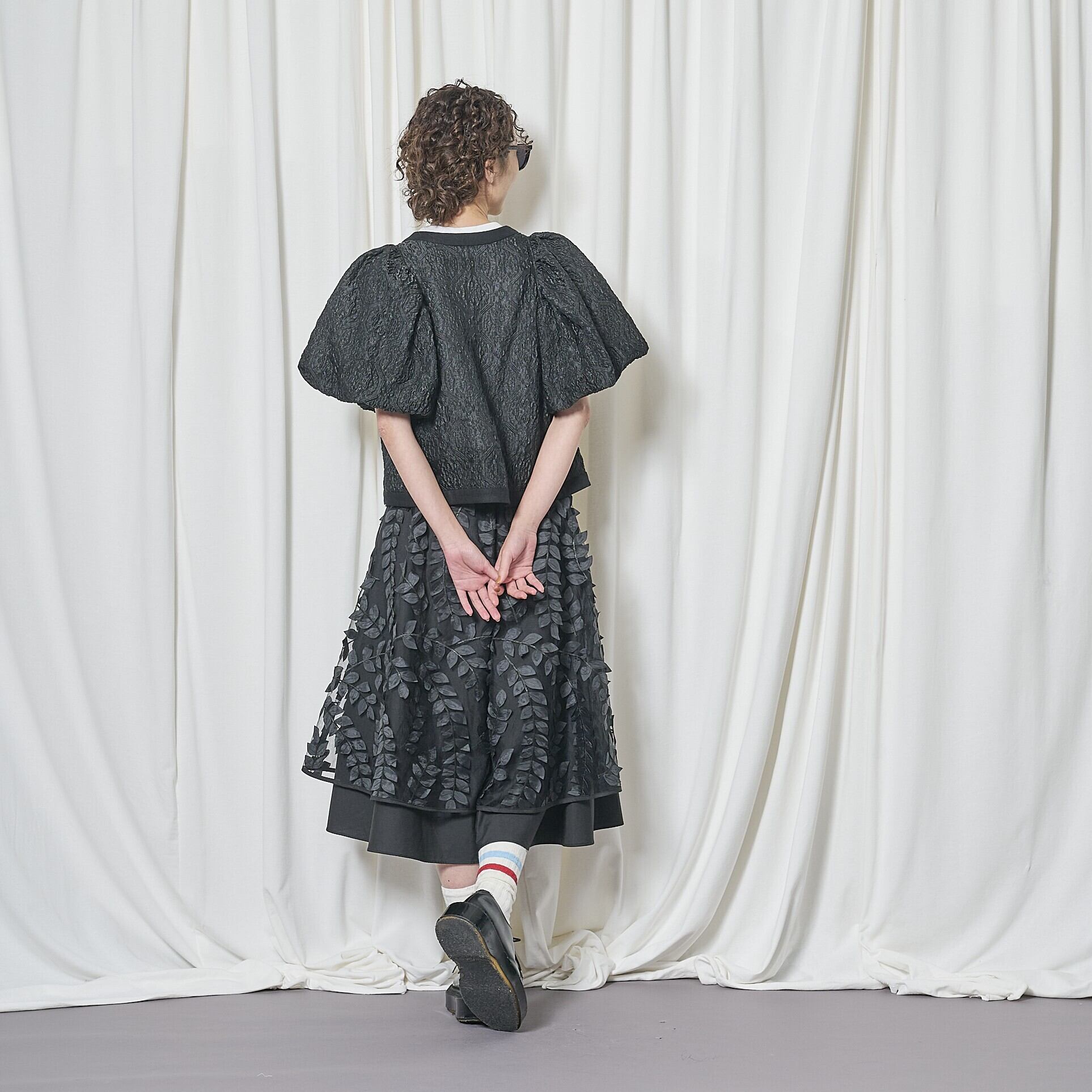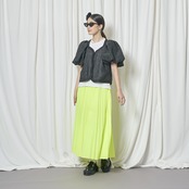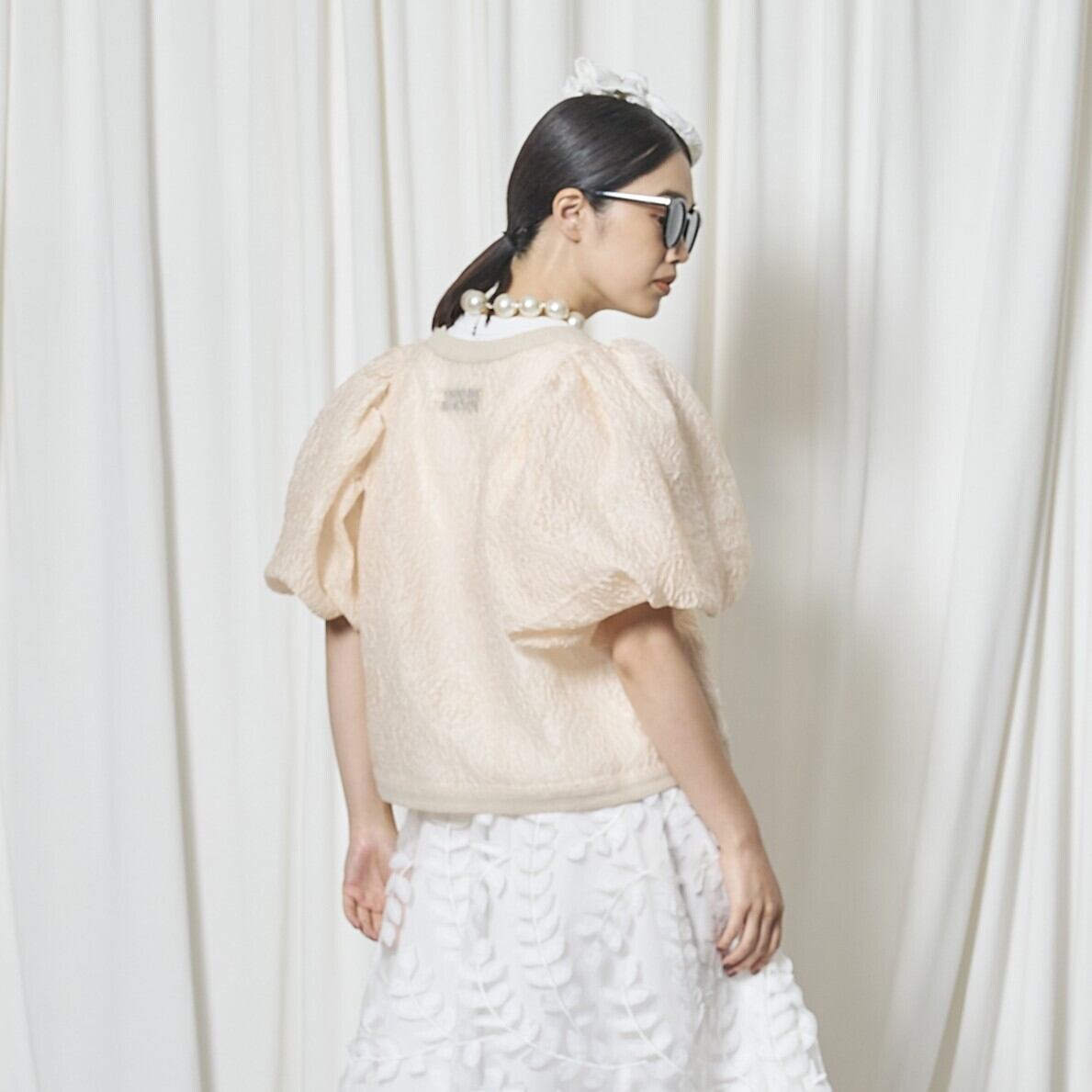 今回、ちょっと変わったジャケットをデザインしました。今までにないエンボス加工のシアー素材で、半袖パフスリーブのボレロ型ジャケットです。袖の膨らみのパターンと、ハリ感のある素材がベストマッチで、フワッと広がるパフスリーブ。このパフ具合の出来上がりはとても不安で仕方ありませんでしたが、パタンナーが可愛いシルエットに仕上げてくれました。とにかく気に入ったデザインで、オリジナリティのあるシルエットに仕上がっていると思います。ミニジャケットながら、両サイドにスラッシュポケット付きで、とにかく可愛いなと思います。