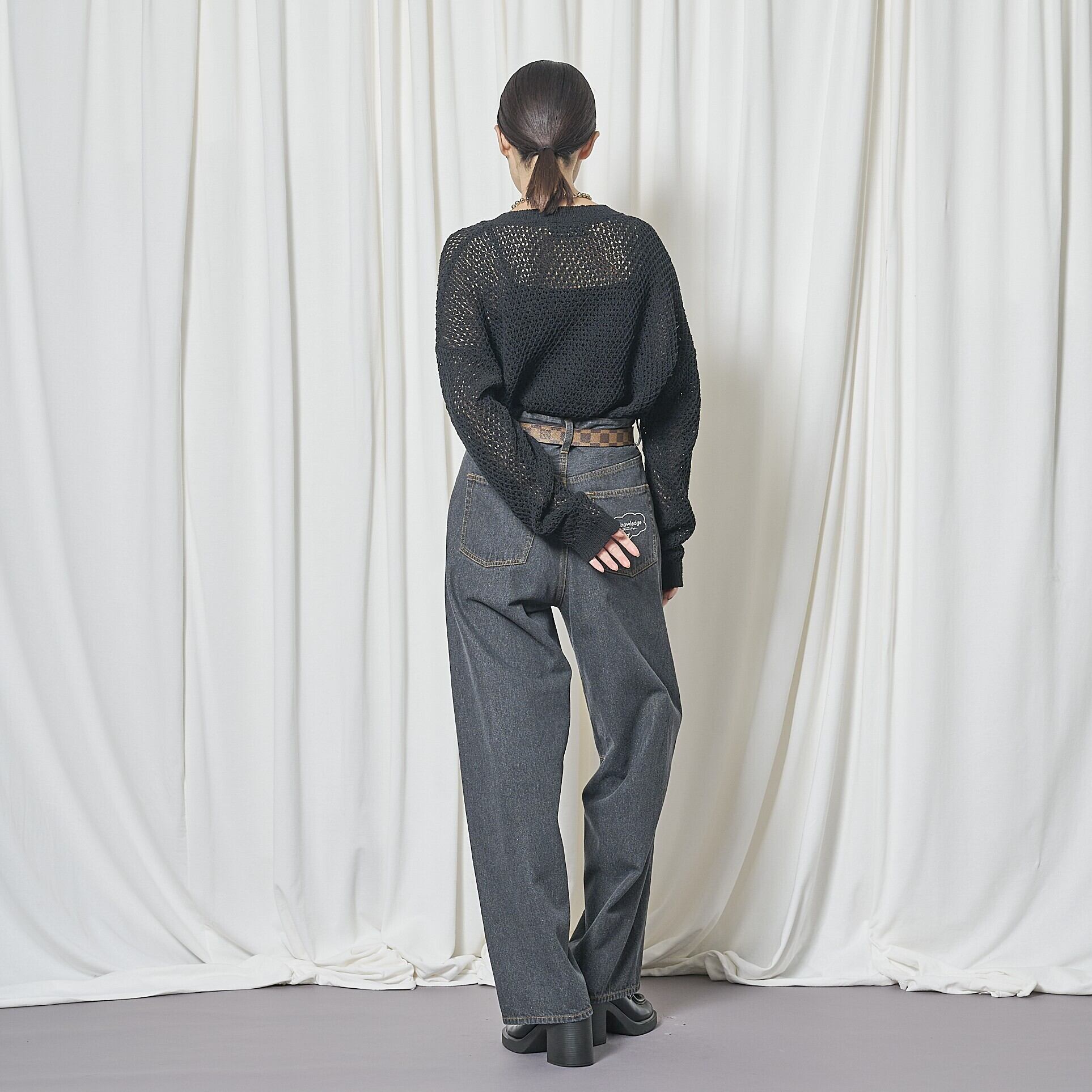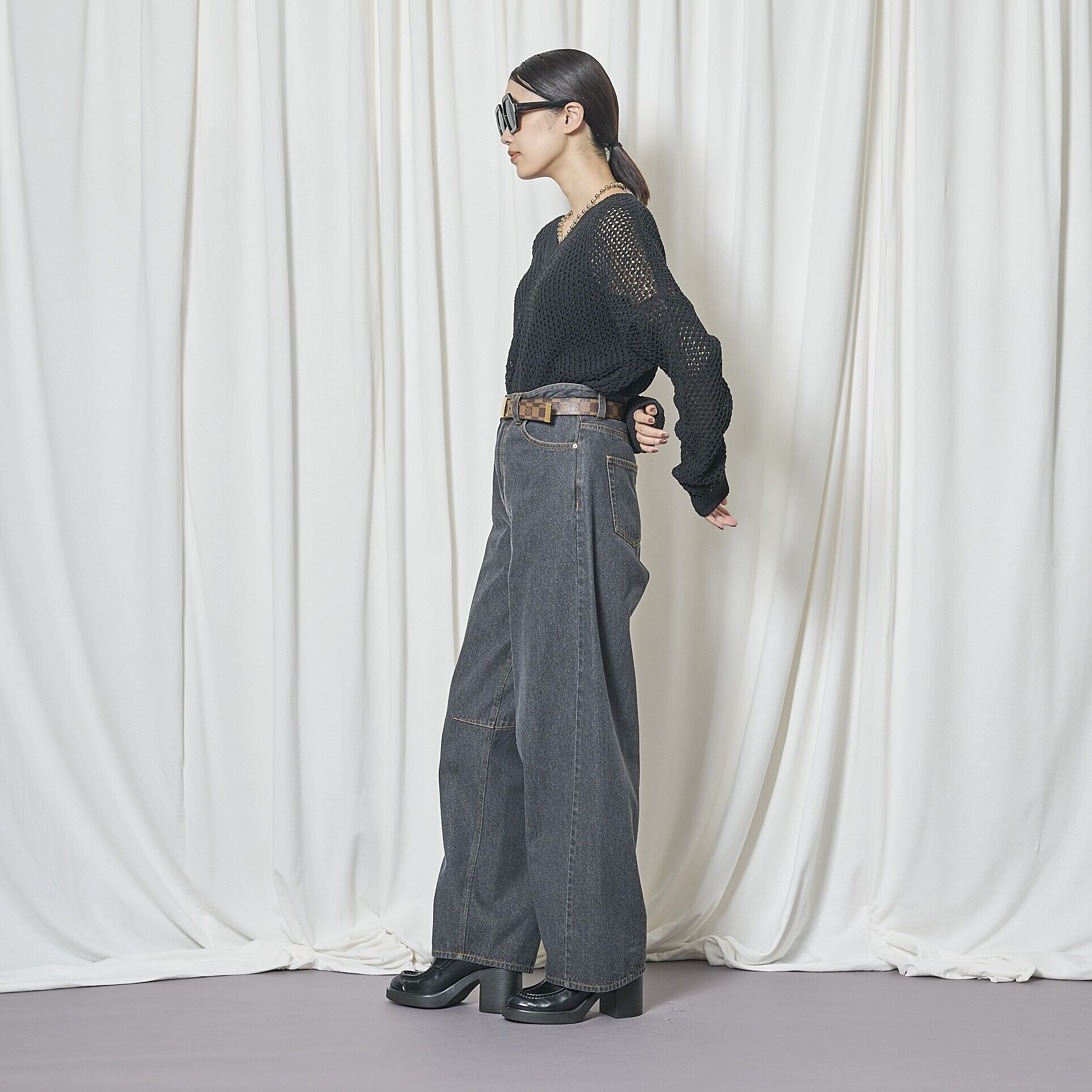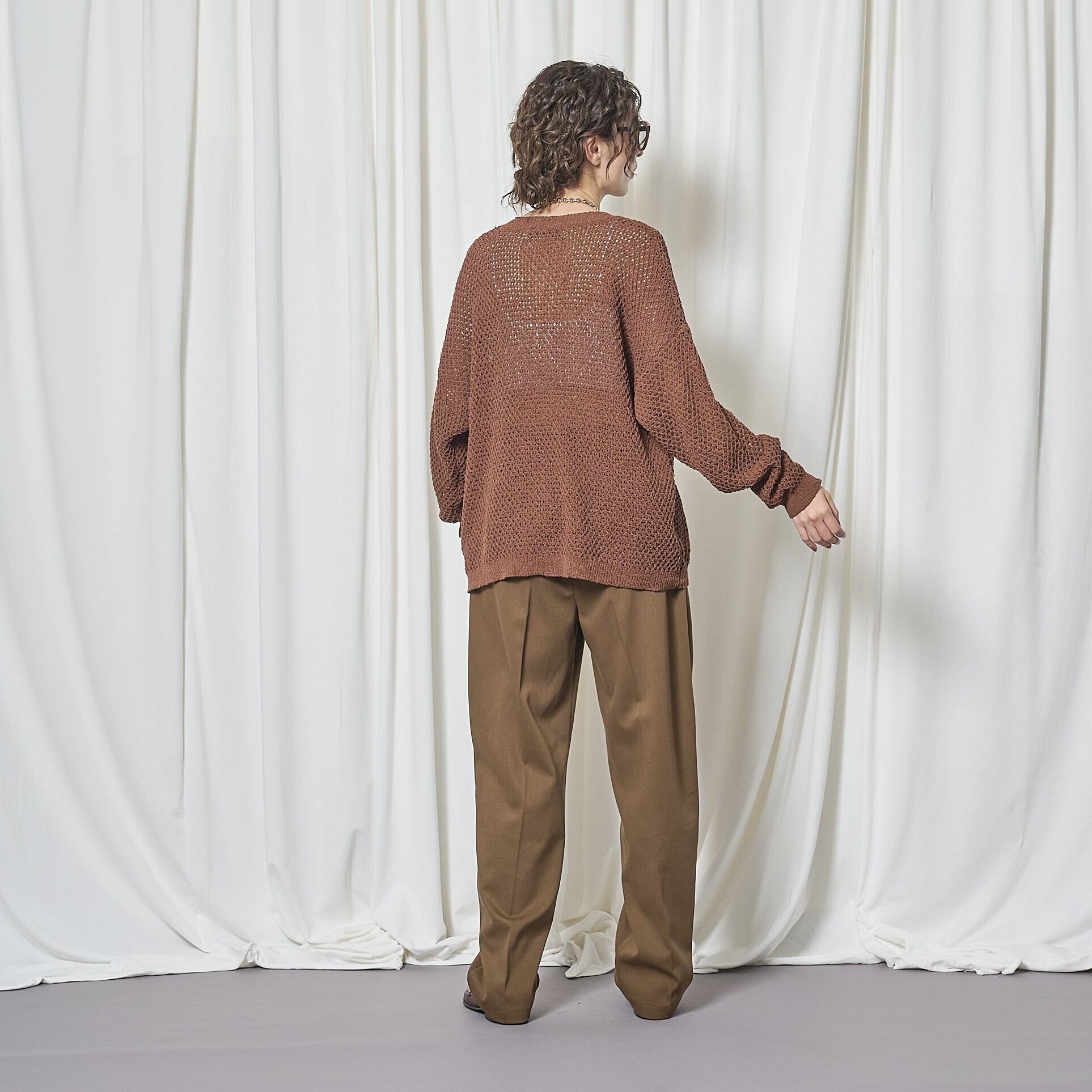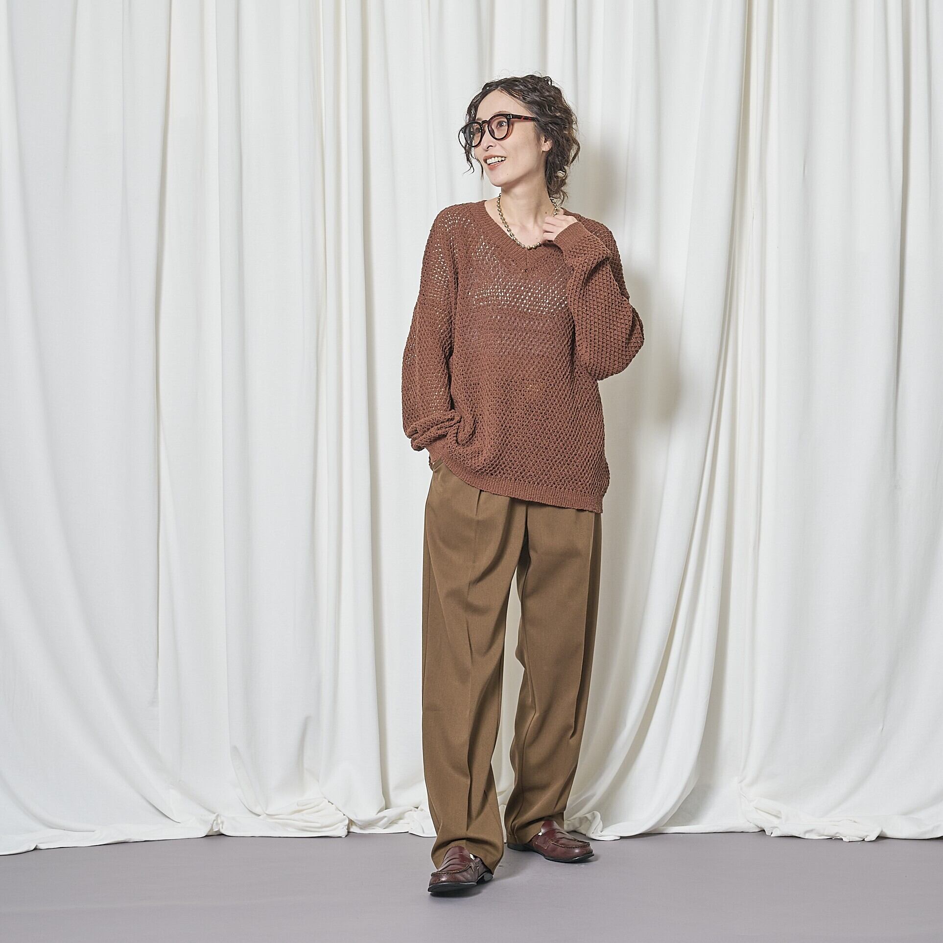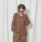シアーなウエアは流行していますが、このニットは透けすぎず、上品に着られるのがポイントです。ざっくりしたドライタッチの糸です。今回は少し大人っぽい雰囲気も取り入れようかと思いVネックにしてみました、開き過ぎない、胸元のセクシーさを感じさせないV の開き方にしています。袖はやや長めで、身頃は大きめ、袖は普通のサイズ感なので、女性らしいシルエットがかないます。いつもなら、袖底を下げてオーバーサイズにするところを、今回は女性サイズにしています。シンプルだからこそ着回しがしやすいです。私のディレクションするウエアは、あまり他でない物を作って表現していきたいと考えていますが、普通にあると便利で、派手なデザインとの着回しに便利なシンプルなデザインも時に取り入れています。このニットは単色で無個性ではありますが、かなり着回しが効くので重宝する、とスタッフにとても人気のニットでした。実際に試着したところ、夏に非常に着やすくて、とても涼しくて万能でした。2万以下であるプライスも魅力ですが、真夏にあると1番に使えるものになるかもしれません。