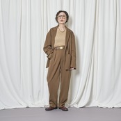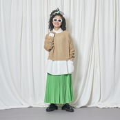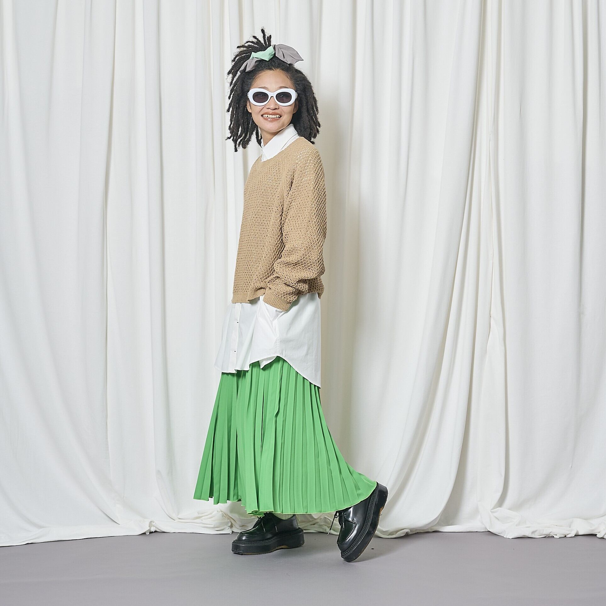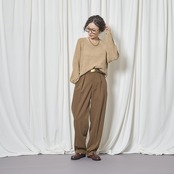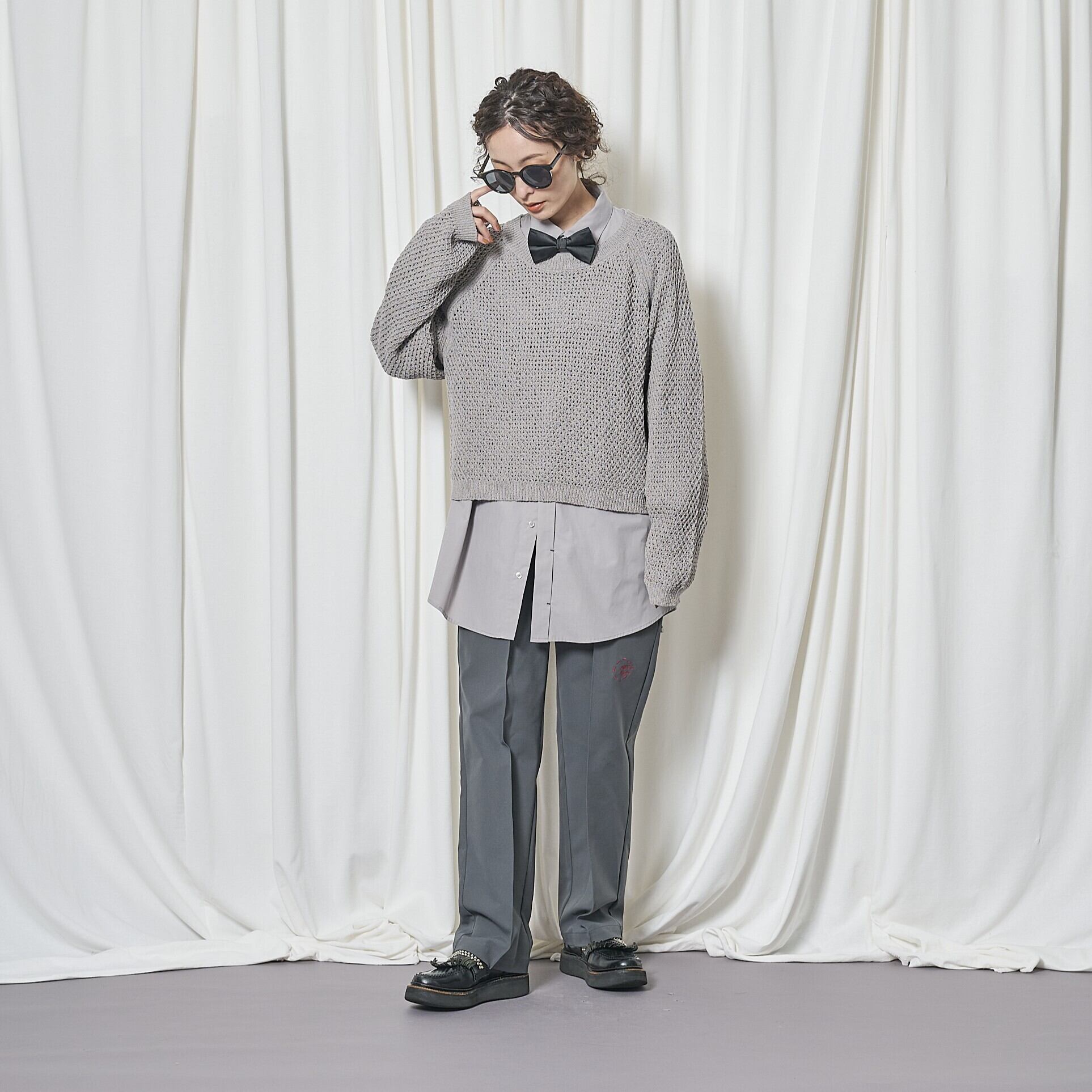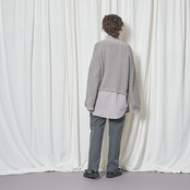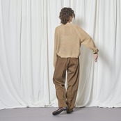シアーなウエアは流行していますが、このニットは透けすぎず、上品に着られるのがポイントです。ざっくりしたドライタッチの糸です。今回は少し大人っぽい雰囲気も取り入れようかと思いVネックにしてみました、開き過ぎない、胸元のセクシーさを感じさせないV の開き方にしています。袖はやや長めで、身頃は大きめ、袖は普通のサイズ感なので、女性らしいシルエットがかないます。いつもなら、袖底を下げてオーバーサイズにするところを、今回は女性サイズにしています。シンプルだからこそ着回しがしやすいです。私のディレクションするウエアは、あまり他でない物を作って表現していきたいと考えていますが、普通にあると便利で、派手なデザインとの着回しに便利なシンプルなデザインも時に取り入れています。このニットは単色で無個性ではありますが、かなり着回しが効くので重宝する、とスタッフにとても人気のニットでした。実際に試着したところ、夏に非常に着やすくて、とても涼しくて万能でした。2万以下であるプライスも魅力ですが、真夏にあると1番に使えるものになるかもしれません。
