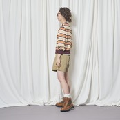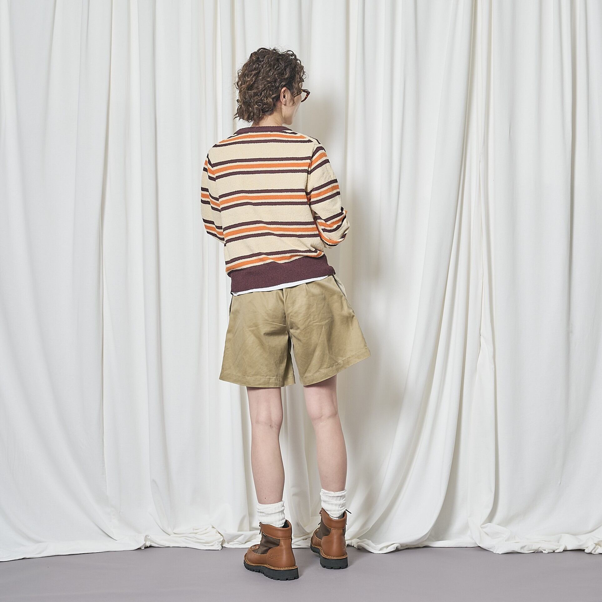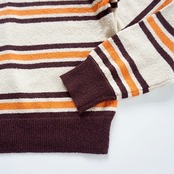 レディースサイズのニットです。袖はやや長め。身頃はややゆったり目です。サラッとしたサマーニットです。クルーの首の開きは、詰まりすぎす着やすいと思います。今回のボーダーは、少しブラウン系を多めに入れています。流行の流れは、なんとなく70年代を彷彿させるカラーリングが強くなって、ボーイズっぽい雰囲気が流行していますが、完全に流行を意識したボーダーをデザインしました。ボーダーの幅で雰囲気が変わりますが、今回は70’sを意識して幅を作ってみました。クリームはワイン色を強くして、これまでに出したことのないボーダーを出しました。この70年代風のカラーの組み合わせが非常に気に入っています。