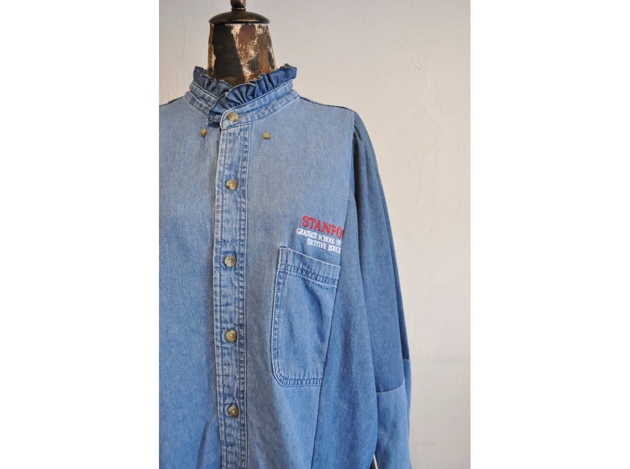 ●古着のデニムシャツを解体し、パターンで構築したサイドパネルを挟み込んで作られたシャツ。