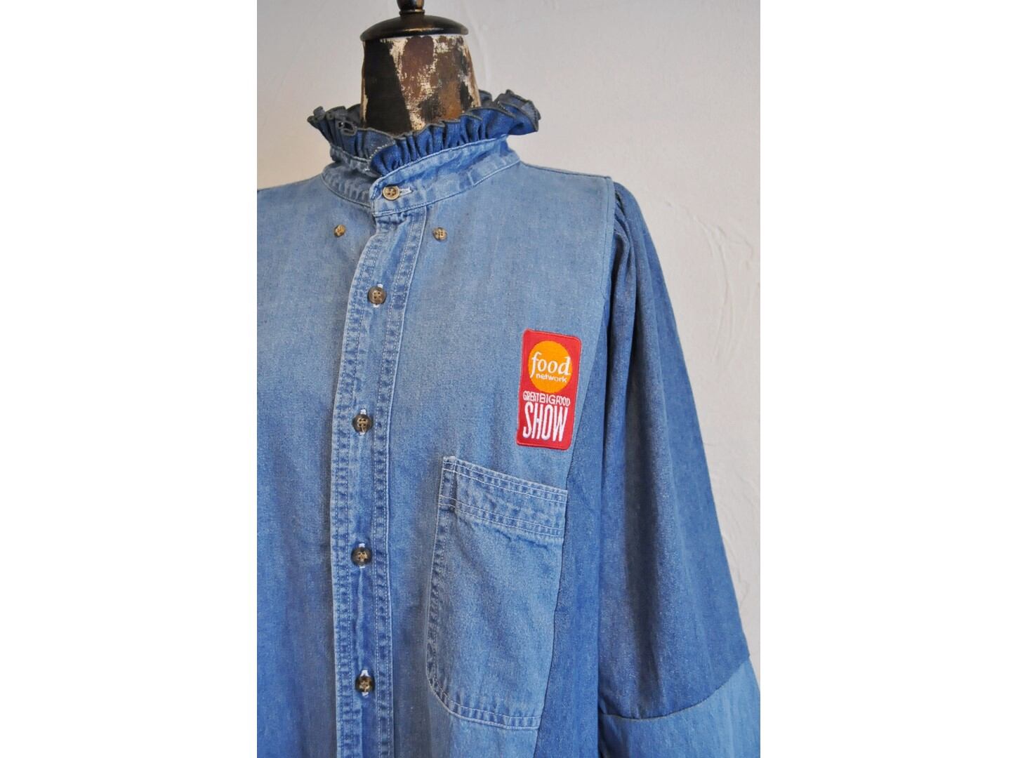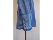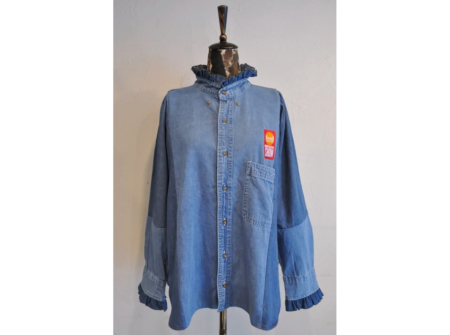 ●古着のデニムシャツを解体し、パターンで構築したサイドパネルを挟み込んで作られたシャツ。
