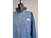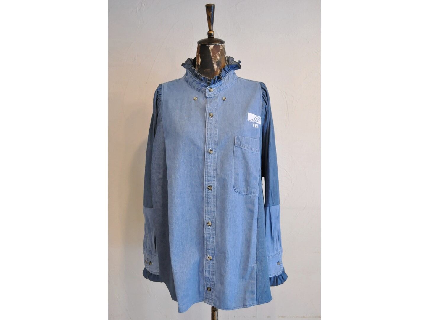 ●古着のデニムシャツを解体し、パターンで構築したサイドパネルを挟み込んで作られたシャツ。