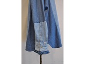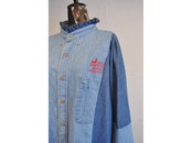 ●古着のデニムシャツを解体し、パターンで構築したサイドパネルを挟み込んで作られたシャツ。