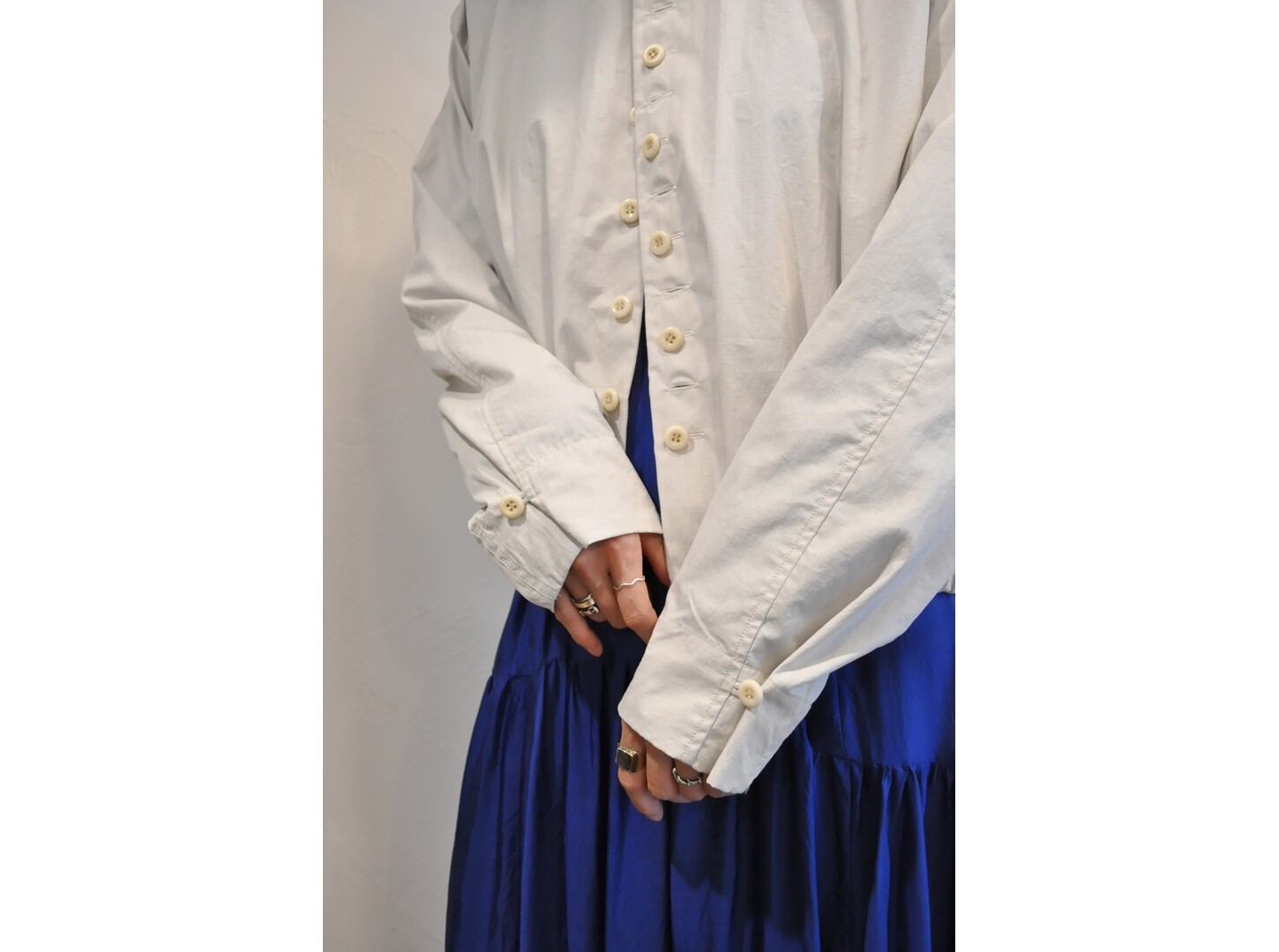 表情のあるシャツ地を使用し、コンパクトなスタンドカラーは首元から少し離れる設計で顔周りをすっきり見せてくれます。
