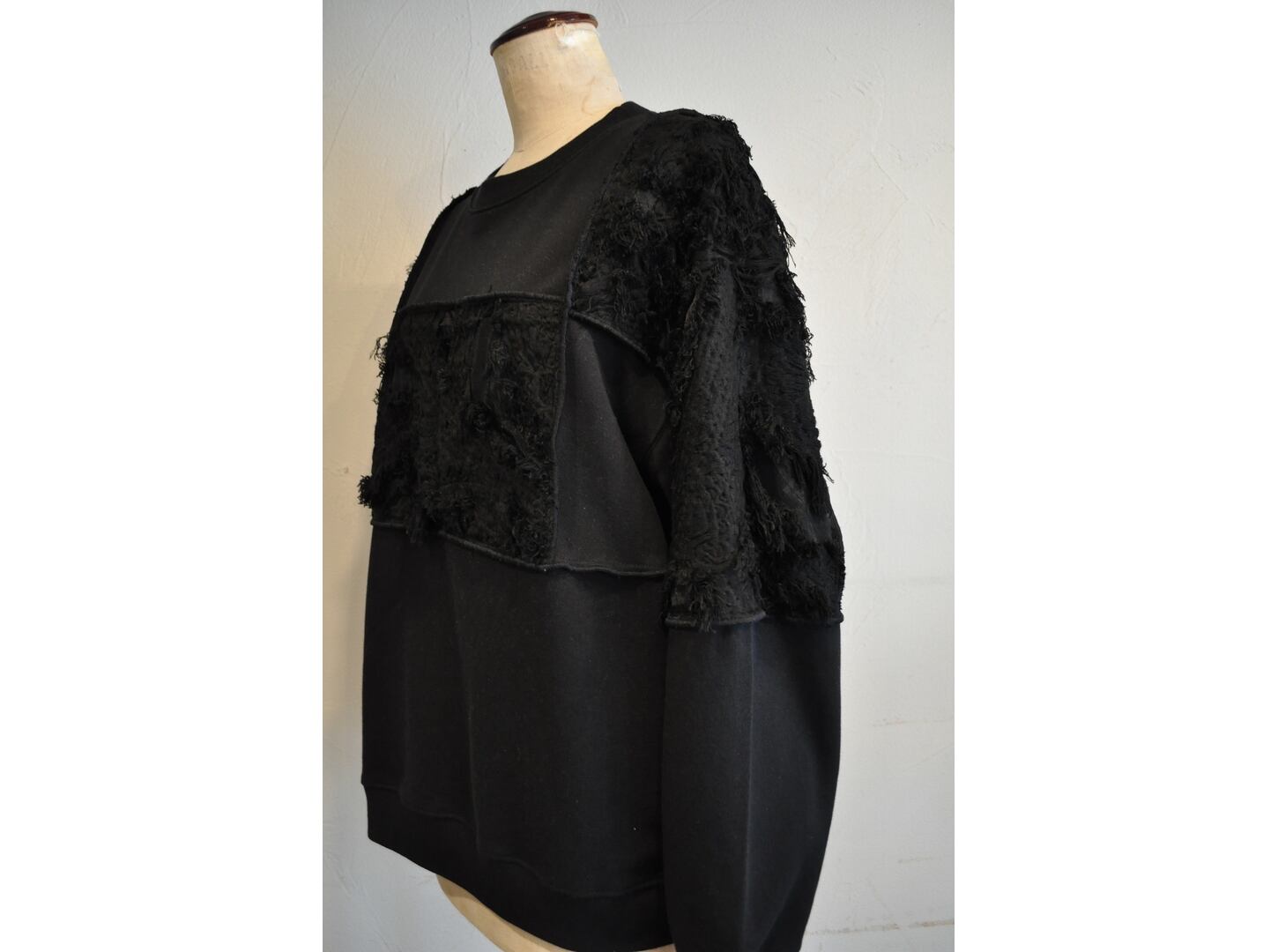 ●スウェットをベースに、身頃と袖に立体感のあるフリンジジャガード生地を切り替えたデザインスウェットです。