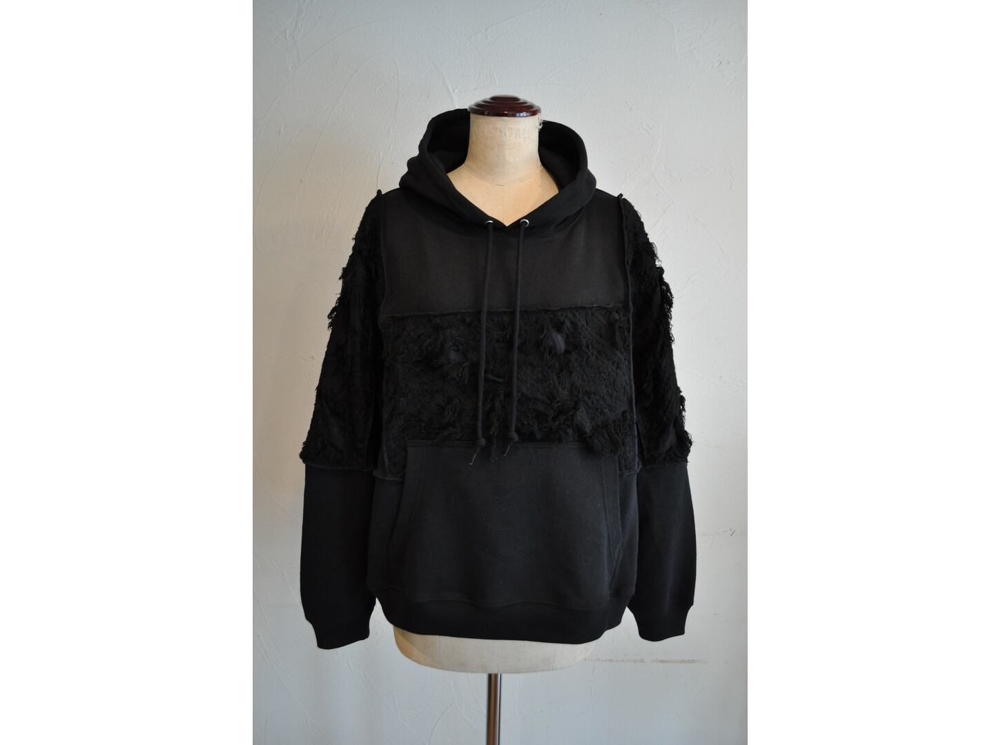 ●スウェットパーカをベースに、身頃と袖に立体感のあるフリンジジャガード生地を切り替えたデザインスウェットです。