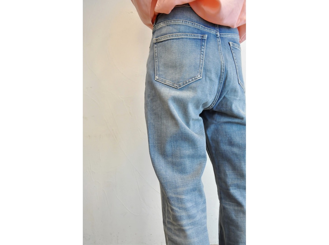 レーヨンを交織したデニム生地は、柔らかく肌に馴染みやすく、ストレッチ性にも優れ、動きやすさが抜群です。