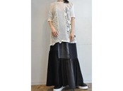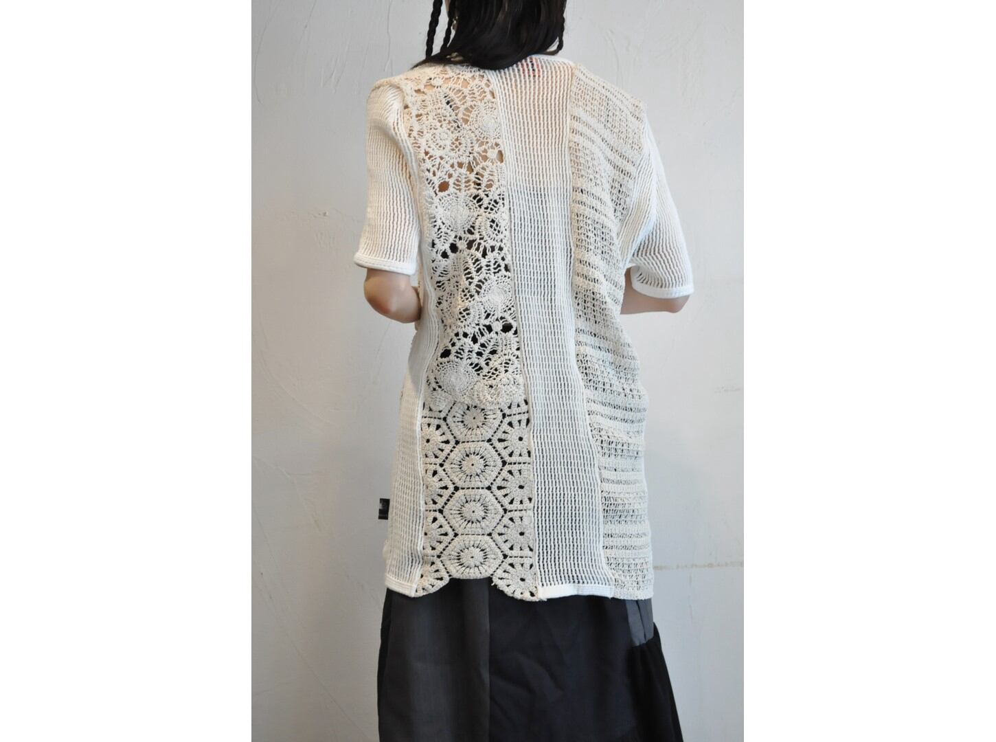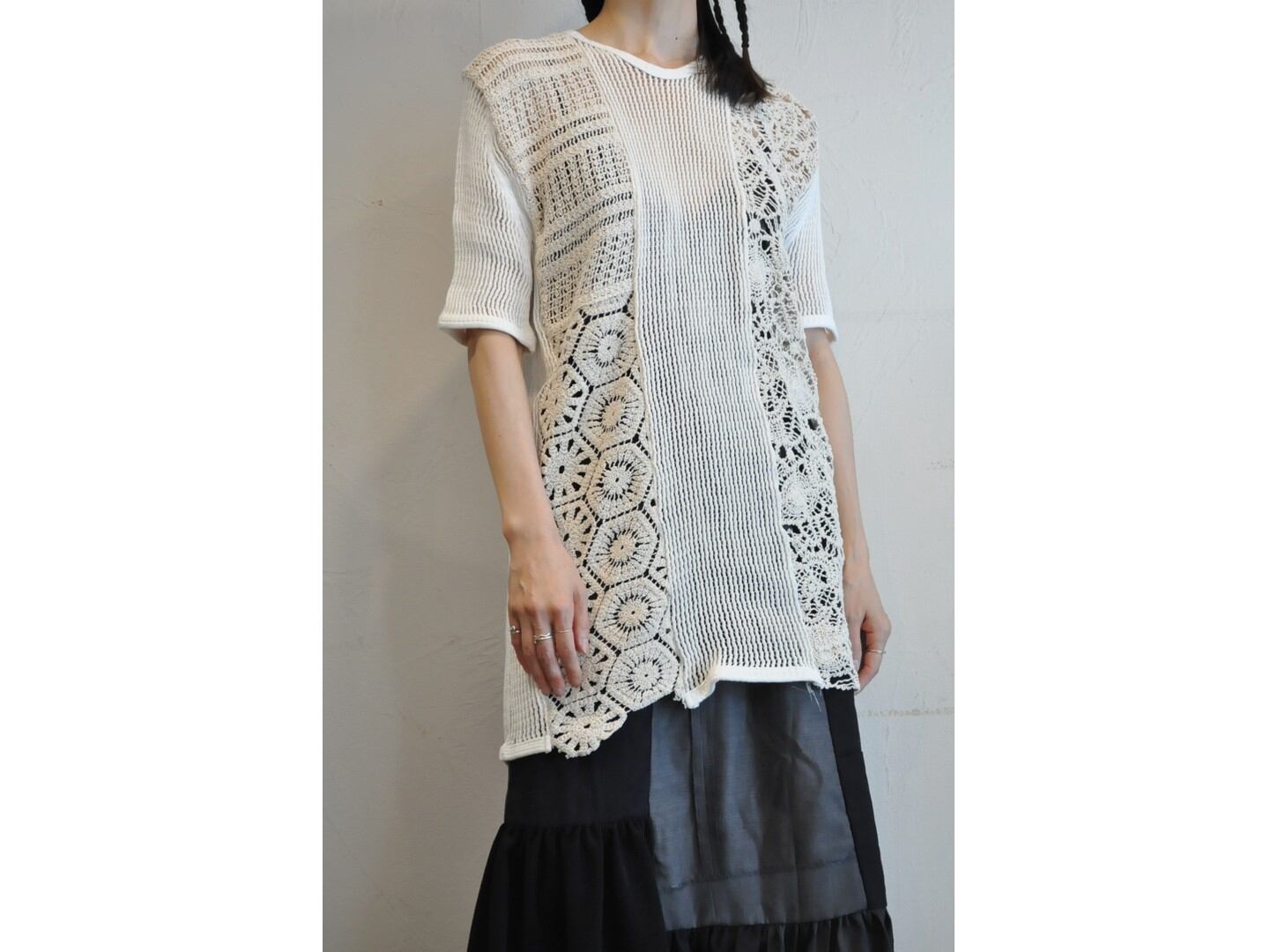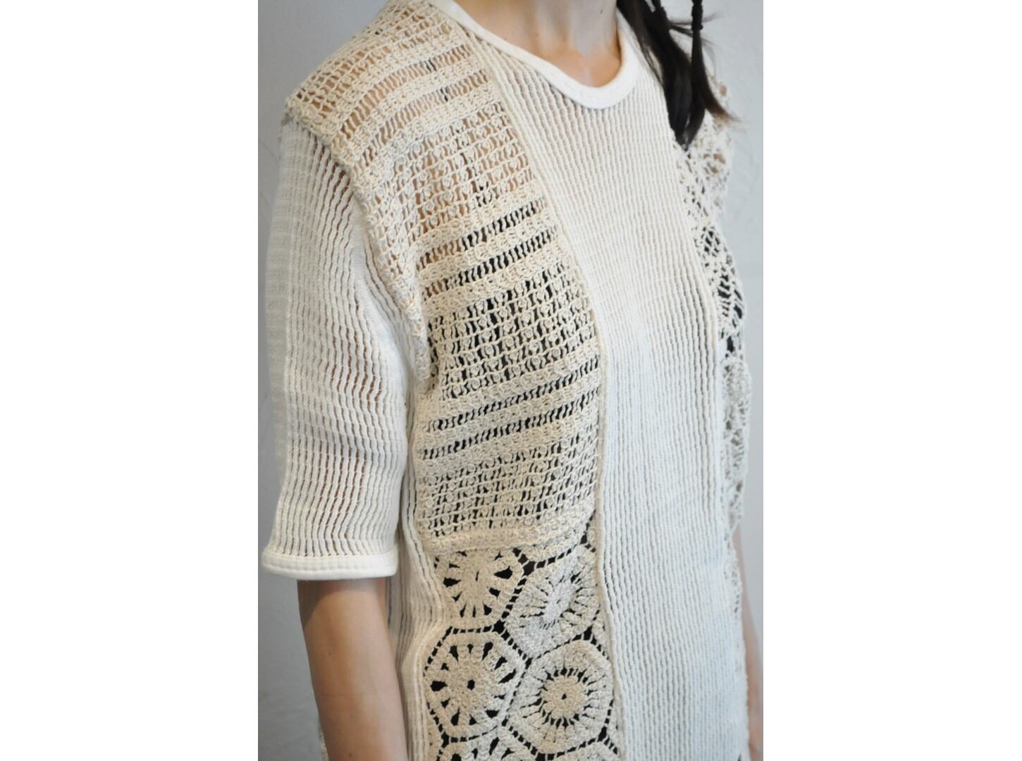 ●軍物のデンマークネットTシャツと、クロシェレースのパッチワークでつくられたカジュアルなデザインのワンピース。