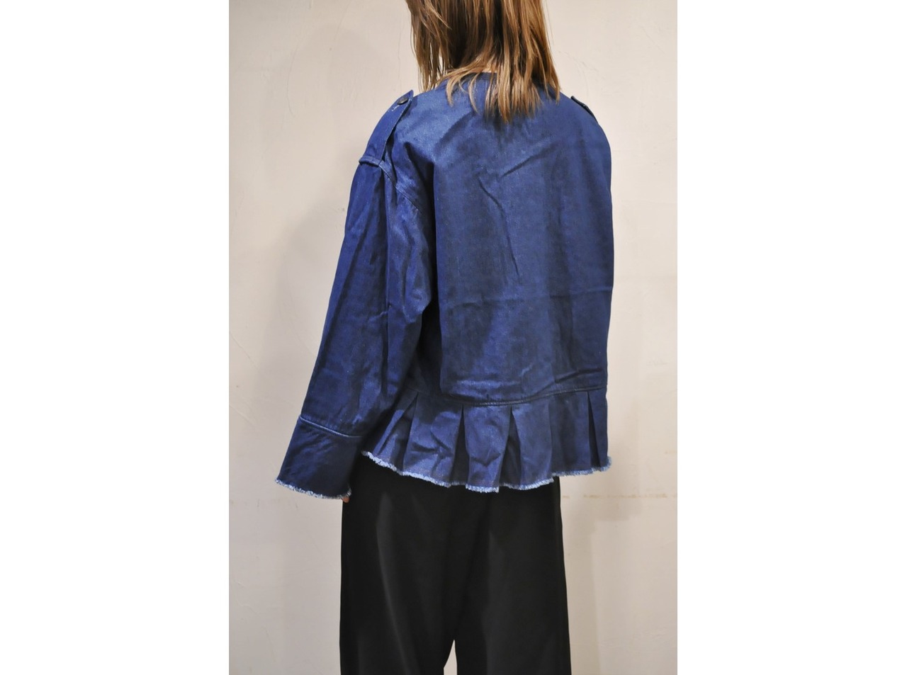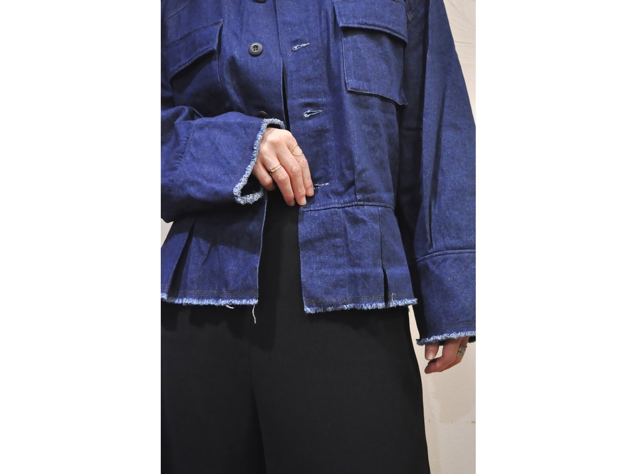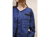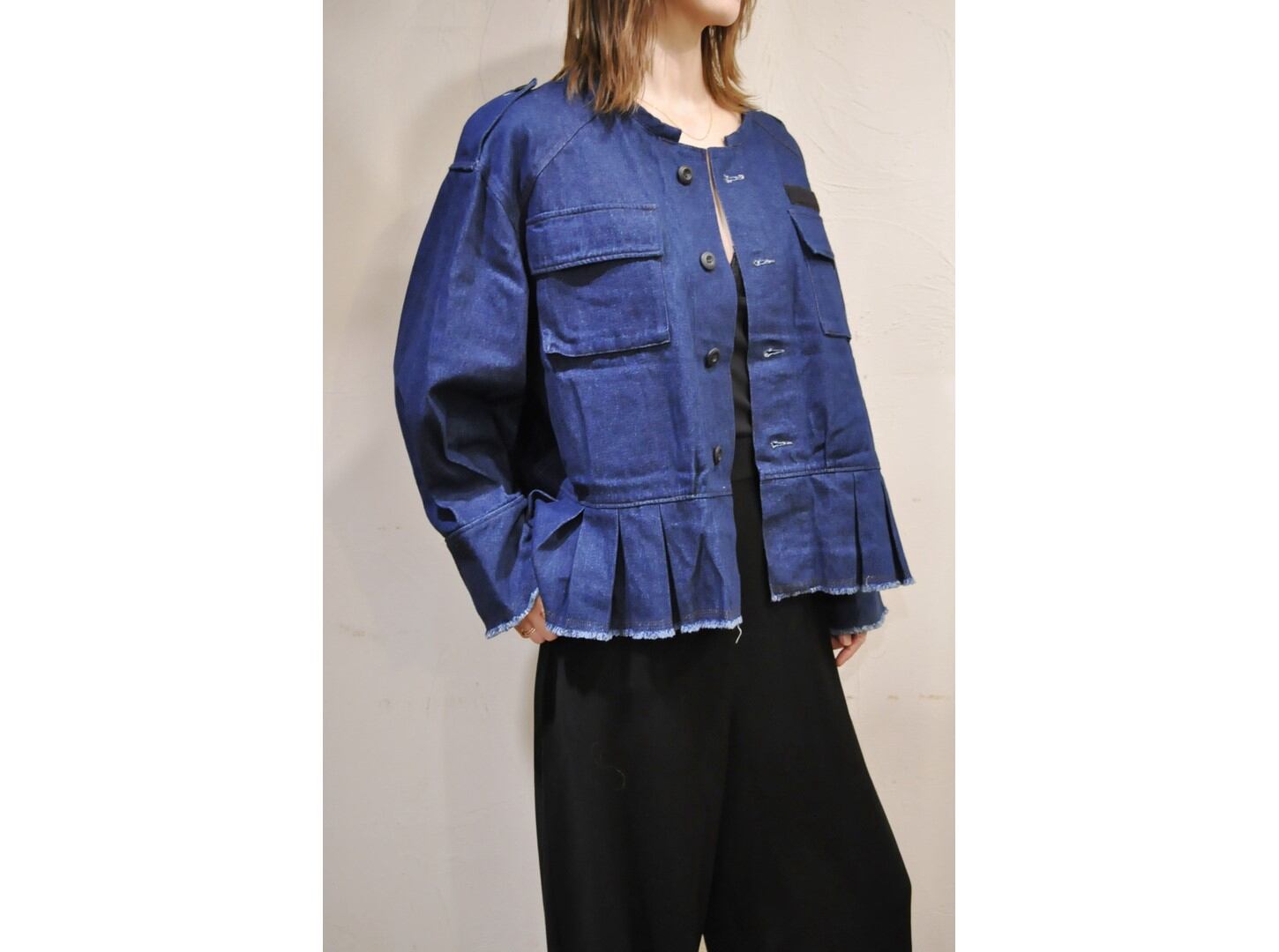 ●ミリタリーアイテムのBDUジャケットをデザインベースに、女性らしさと無骨さを程よくミックスさせたデニムジャケットです。