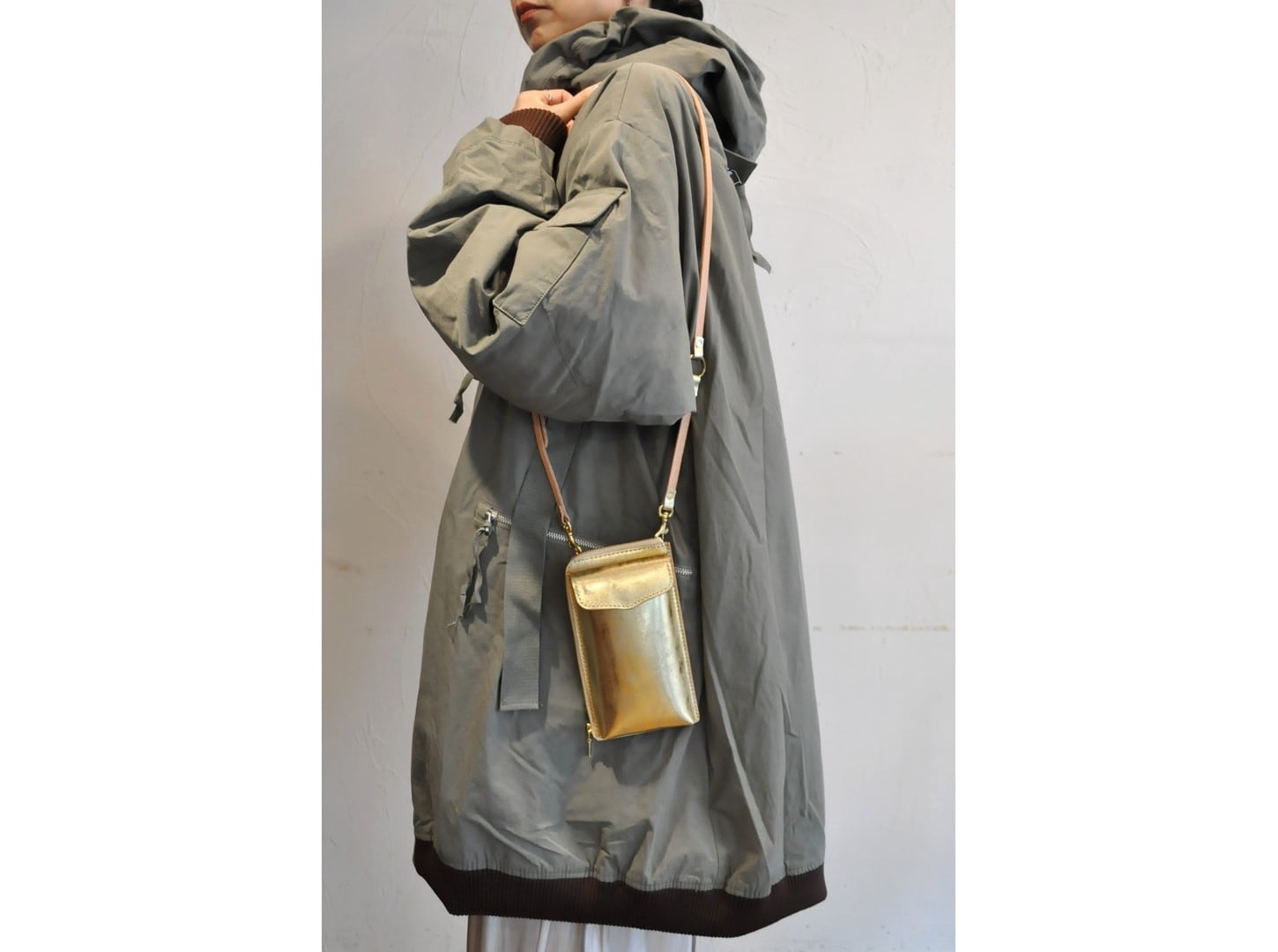 メタリック箔のレザーが特徴的で、