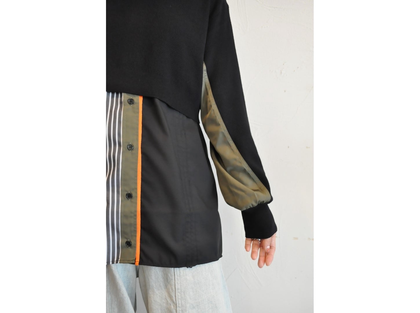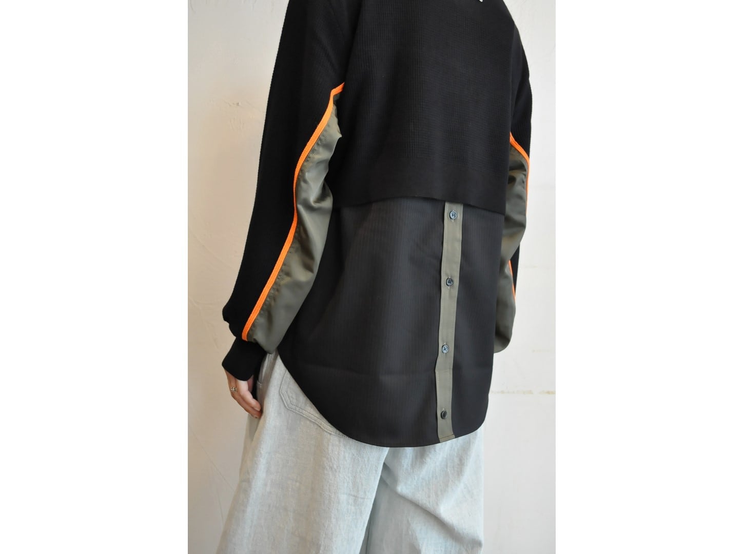 ●異素材を組み合わせたドッキングデザインのニットシャツ。
