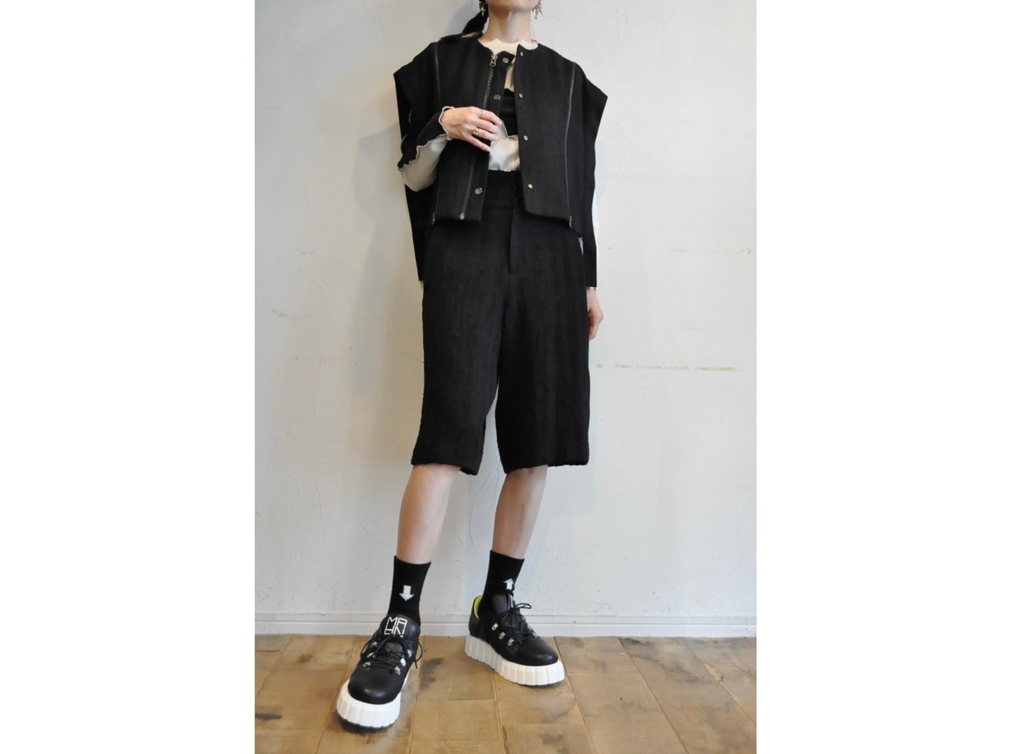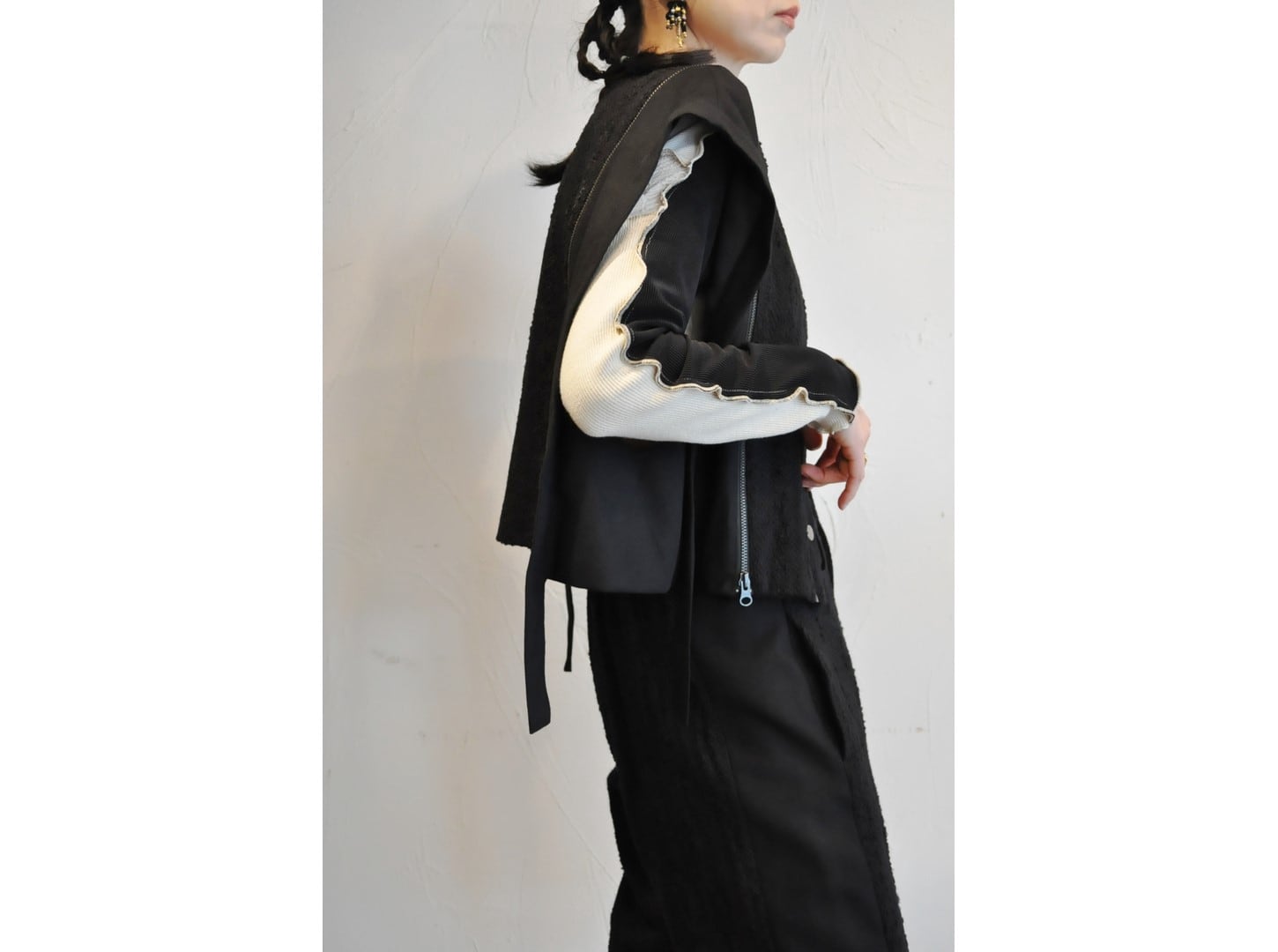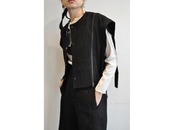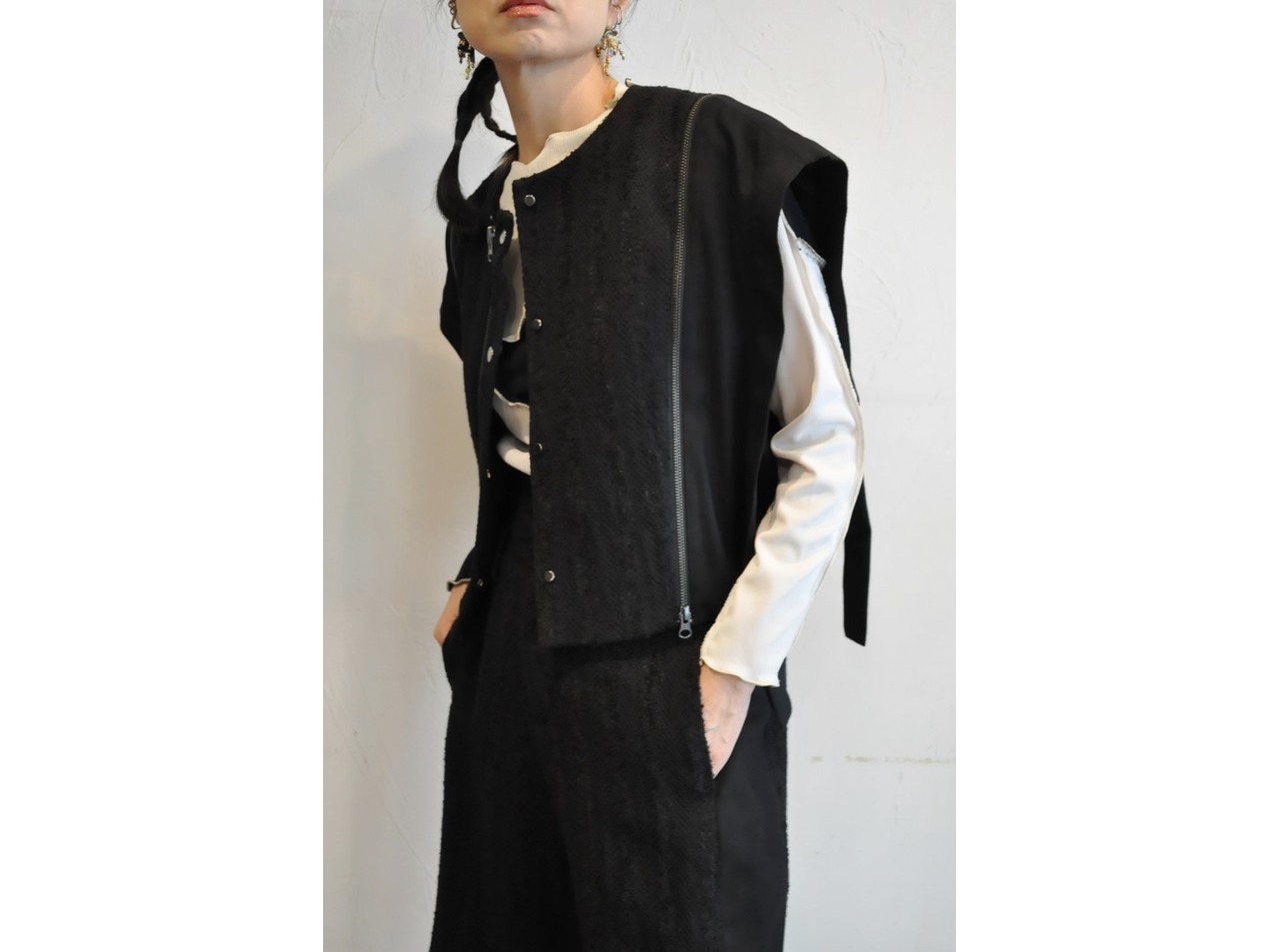 素材のコントラストが洗練された雰囲気があり、構築的なベスト。